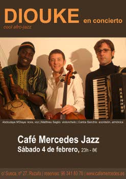 DIOUKE Concierto de Diouke. ¿Cuándo? Fecha Del Saturday, 04 de February del 2012 al Saturday, 04 de February del 2012 HORA 23:00 h ¿Dónde? LUGAR Café Mercedes Jazz Calle Sueca, 27 Ver ficha COOL-AFRO-JAZZ ABDOULAYE N’DIAYE, kora, voz MATTHIEU SAGLIO, violonchelo CARLOS SANCHÍS, acordeón, armónica Artículos relacionados Café Mercedes Jazz