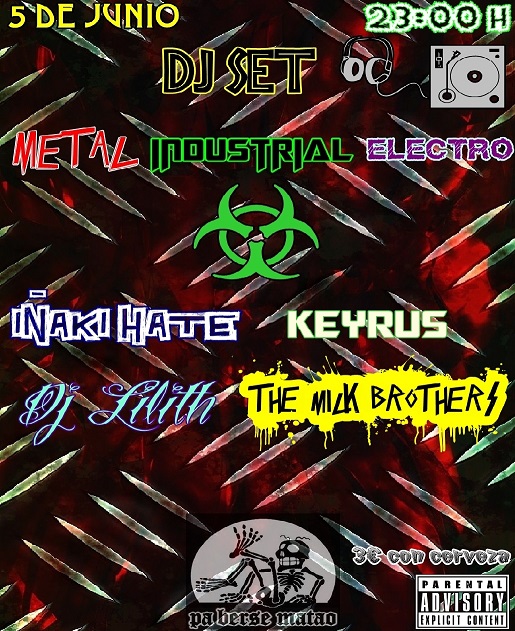 Dj Set Metal / Industrial / Electro [Iñaki Hate / Keyrus / Dj Lilith / The Milk brothers] ¿Cuándo? Fecha Del Friday, 05 de June del 2015 al Saturday, 06 de June del 2015 HORA 23:00 h ¿Dónde? LUGAR Pa Berse Matao Carrer Castellon, 7 Ver ficha Festival con los mejores Dj’s del Genero Metal / Industrial & Electro Rock & musica electronica juntos hasta el amanecer por solo 3€ cerveza incluida !! Sala Paberse Mastao (Sedaví)