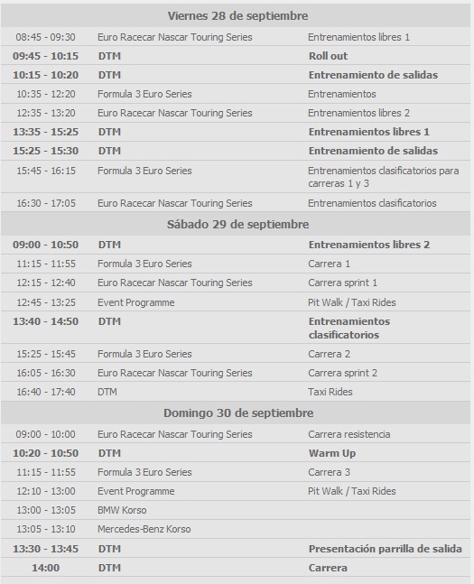 DTM: Campeonato aleman de turismos DTM, el prestigioso Campeonato Alemán de turismo se celebra en el Circuito de Cheste ¿Cuándo? Fecha Del Wednesday, 26 de September del 2012 al Sunday, 30 de September del 2012 HORA 00:00 h ¿Dónde? LUGAR Circuito Ricardo Tormo Autovía A3 Valencia-Madrid, 46380 Ver ficha El DTM regresa al Circuit de la Comunitat Valenciana Ricardo Tormo del 28 al 30 de septiembre de 2012 con el enfrentamiento entre Audi, Mercedes-Benz y BMW. Ya están a la venta las entradas para este increible evento, y se puede elegir entre comprar las entradas y Pases de Paddock los días de su celebración, o hacerlo de manera anticipada para beneficiarse de interesantes descuentos. Los precios pueden ir entre los 3 y los 20 euros, y puedes consultar aquí las diferentes tarifas y los puntos de venta de las entradas. Horarios: Día 26 de septiembre El Circuito Cheste expone el miércoles 26 de septiembre réplicas de los coches de Audi y Mercedes y un simulador de BMW en las instalaciones del Mercado de Colón de Valencia. Tanto Mercedes Benz como Audi han cedido sus coches de exposición para que los valencianos tengan la oportunidad de ver de cerca estos coches que compiten por este título del campeonato de turismos. Por su parte BMW aporta un simulador de cambio de neumáticos en el que los aficionados tendrán la oportunidad de ejercer las funciones de mecánicos del equipo oficial y llevar a cabo un cabio de las ruedas delanteras de unos de sus coches con la supervisión de un equipo especializado y bajo la presión del cronometraje. La actividad se desarrollará durante todo el día desde las 10 de la mañana y hasta las 10 de la noche. Pero el plato fuerte de la jornada es a las 17:30 cuando alguno de los pilotos del Campeonato participan en una presentación abierta al público. El castellonense Roberto Merhi (Mercedes), el catalán Miguel Molina (Audi) y el brasileño Augusto Farfus (BMW) explicarán las características del DTM e invitarán a los aficionados a pasar el fin de semana en el trazado de Cheste.