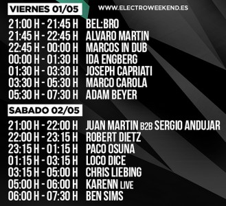 Electro Weekend 2015 Valencia se convertirá en la capital de la música electrónica durante el puente de mayo ¿Cuándo? Fecha Del Friday, 01 de May del 2015 al Saturday, 02 de May del 2015 HORA 21:00 h ¿Dónde? LUGAR Feria Valencia Avenida de las Ferias, s/n Ver ficha Valencia acogerá este año el Festival Electroweekend 2015 durante los días 1 y 2 de mayo en Feria de Valencia. Consulta toda la información sobre eventos en nuestra agenda de Valencia. Electro Weekend cambia este año de ubicación y cambia Benidorm por Valencia. Se instalará en la Feria de Muestras de Valencia, una de los mayores recintos de ferias de Europa. El Festival Electro Weekend realizar una fuerte apuesta centrada en el techno, ya que es el género que más reclaman sus seguidores. Para ello, ha reunido a los mejores djs internacionales en un cartel al nivel de los mejores festivales del mundo. Horarios Electro Weekend 2015 Ya se conocen los horarios del Electro Weekend 2015, por lo que ya puedes planear tu fin de de semana para disfrutar de los mejores djs que conformarán el cartel del festival este año. Algunos dj’s como Adam Beyer, Bens Simsl, Marco Carola o Joseph Capriati, podrán la melodía a esta fiesta que situará a Valencia como capital de la electrónica. Las entradas para Electro Weekend 2015 ya están a la venta a través de la página web del Festival. El precio de la entrada general es de 42 euros actualmente, pero va aumentando según se acerca la fecha de inicio. *Descubre todos los festivales de música en Valencia. Artículos relacionados Conciertos Valencia Festivales de música en València Primavera en Valencia