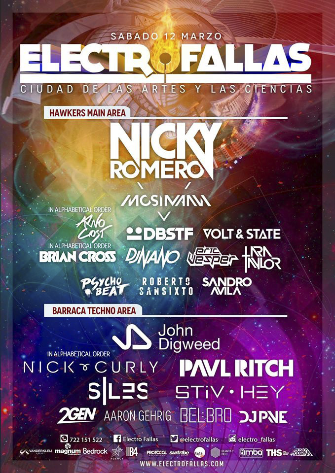 Electrofallas 2016 El 12 de marzo la Ciudad de las Artes y las Ciencias vibra con los dj´s de ElectroFallas 2016 ¿Cuándo? Fecha Del Saturday, 12 de March del 2016 al Saturday, 12 de March del 2016 HORA 21:00 h ¿Dónde? LUGAR Ciudad de las Artes y de las Ciencias Avda. Autopista del Saler, 7 Ver ficha Se celebra una nueva edición de Electrofallas 2016. El evento da la bienvenida a la fiesta grande de Valencia con una serie de sesiones de dj´s de música electrónica reconocidos internacionalmente, que harán la inauguración más potente a las Fallas 2016 desde la Ciudad de las Artes y las Ciencias de Valencia. La cita tendrá lugar el sábado 12 de marzo a las 22:00 horas y se prolongará hasta las 7:00 de la mañana del domingo 13 de marzo. ElectroFallas dispondrá de dos escenarios, EDM (música electrónica comercial) y Techno (sonidos más duros y underground). El 12 de marzo actuarán en Valencia de artistas de primer nivel en la música electrónica internacional. El aclamado DJ holandés Nicky Romero es la estrella indiscutible, junto al veterano británico John Digweed, y los franceses Paul Ritch y Arno Cost. La representación nacional está encabezada por los deejays Brian Cross y DJ Nano, y también por la valenciana Lara Taylor, la vocalista de moda en el circuito dance en España. Se trata de un evento que hará las delicias de los amantes de la música electrónica. Las entradas para ElectroFallas 2016 están a la venta en su web a partir de 25 euros. Cartel de Fallas Artículos relacionados Fallas 2025 Programa de Fallas 2016 Exposición del Ninot 2025 Crida 2025 Viajar a Valencia en Fallas 2016