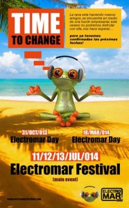 Electromar Festival 2014 Del 11 al 13 de agosto en Bigastro (Alicante) se celebra el Electromar Festival 2014 ¿Cuándo? Fecha Del Friday, 11 de July del 2014 al Sunday, 13 de July del 2014 HORA 01:00 h ¿Dónde? LUGAR Bigastro Plaza Constitución, 1 Ver ficha Del 11 al 13 de julio se celebra en la localidad alicantina de Bigastro el festival de música electónica e indie conocido como Electromar Festival 2014. Para esta edición aún no se conocen ni los grupos ni los dj’s que formarán parte del cartel del Electromar Festival 2014. Electromar Festival 2014 de Bigastro tiene dos fechas extra en el calendario conocidas como Electromar Day. Son dos días en los que se puede disfrutar de una pequeña representación de la fiesta que se vive en el Electromar Festival 2014. Un festival que reúne a los mejores dj’s y grupos en un festival de música electrónica e indie. Próximamente informaremos del cartel del Electromar Festival 2014 de Bigastro, sus horarios, así como de las entradas para asistir a este festival de verano 2014. El Electromar Festival 2014 es una cita obligada del verano en Valencia para los amantes de la música electrónica y de la música indie. ¿Qué hacer hoy en Valencia? Consulta más festivales de verano en Valencia 2014 y más eventos en nuestra agenda. Artículos relacionados Festivales Verano Valencia 2014 FIB 2014 Arenal Sound 2014