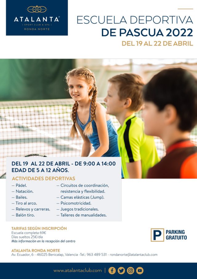Escuela de Pascua Atalanta Sport Club Spa En estas vacaciones de Pascua tienes una opción genial para tu hijo, ¡la escuela de deporte de Atalanta! ¿Cuándo? Fecha Del Tuesday, 19 de April del 2022 al Friday, 22 de April del 2022 HORA 09:00 h ¿Dónde? LUGAR Benicalap Barrio de Benicalap Ver ficha Comprar entradas Llega la Pascua y es hora de pensar qué hacer con los niños, sabemos que tu tranquilidad lo es todo y que quizás estés muy ocupado, por eso Atalanta Ronda Norte y Atalanta Ramón Asensio han organizado actividades para que los más pequeños de la casa la pasen increíble y tú te despreocupes. Échale un vistazo a nuestra agenda para que estés enterado de todos los eventos y actividades con niños. El deporte es la mejor opción para tu hijo en estas vacaciones, con deporte aprenderán sobre el esfuerzo en equipo y además, ¡conocerán nuevas personas! Por eso, Atalanta ha organizado una Escuela de Pascua del 19 al 22 de abril para que estos días sean inolvidables: psicomotricidad, juegos tradicionales, talleres, dinámicas de grupo, natación, pádel, bailes, tiro al arco, camas elásticas, balón tiro, y muchas más. Todas estas actividades tienen como finalidad educar a los niños sobre los deportes, su importancia en la vida diaria y todo esto mientras se divierten y lo pasan bien. Fechas de la escuela: Del 19 al 22 de abril Horarios: De 9:00h a 14:00h Edades: De 5 a 12 años Parking: gratuito Si quieres más información puedes rellenar este formulario llamar al 963 489 531 (Ronda Norte) o 963 60 11 61 (Ramón Asensio) Artículos relacionados Exposición de Titanic en València Comer con niños en València Escape room en València
