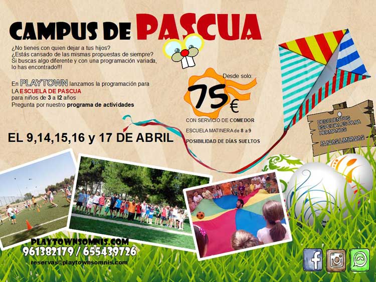 Escuela de Pascua en Playtown Somnis El local de ocio para niños Playtown Somnis ha organizado una Escuela de Pascua para los más peques los días 9, 14, 15, 16 y 17 de abril ¿Cuándo? Fecha Del Thursday, 09 de April del 2020 al Friday, 17 de April del 2020 HORA 08:00 h ¿Dónde? LUGAR Playtown Somnis Plaça Dos de Maig, núm. 3 Ver ficha Playtown Somnis, el lugar de ocio en Valencia preferido por los niños, prepara para las vacaciones de Pascua 2020 actividades muy interesantes para los peques de la casa. Si quieres disfrutar de los planes con niños en Valencia y del resto de eventos que se celebran en la ciudad, echa un vistazo a nuestra agenda de Valencia. Playtown Somnis ha organizado para estas fiestas una programación con muchas sorpresas. La temática no podía ser otra que las Pascuas. Los días 9, 14, 15, 16 y 17 de abril en este local de ocio en València se vivirán las vacaciones de una manera especial en el Campus de Pascua que han preparado. Esta escuela de pascua en València está pensada para niños de entre 3 y 12 años, que disfrutarán de unos días increíbles en Playtown Somnis. Además, es esta fábrica de sueños infantil buscan divertir a cuantos más niños mejor y, por eso, habrá descuentos para hermanos, servicio de comedor, escuela matinera de 8 a 9 de la mañana y posibilidad de contratar días sueltos. Consulta más información, el programa de actividades o cualquier duda enviando un correo a [email protected] o llamando a 961 382 179/ 655 439 726. Artículos relacionados Dónde celebrar cumpleaños con niños en València Mostra de Vinos y Alimentos de la Comunidad Valenciana Gran Feria Andaluza en Valencia 2023 Agenda Mensual de Playtown Somnis