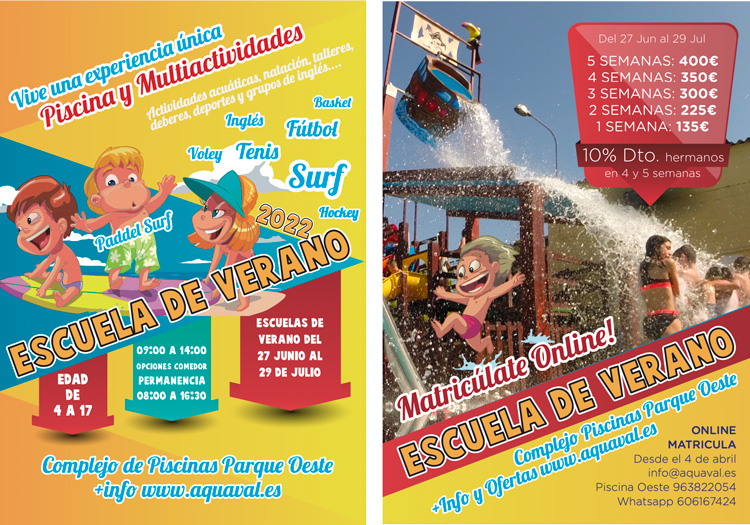 Escuela de verano en la Piscina Parque del Oeste Aquaval organiza una escuela de verano deportiva para niños en València ¿Cuándo? Fecha Del Monday, 27 de June del 2022 al Friday, 29 de July del 2022 HORA 09:00 h ¿Dónde? LUGAR Piscina Parque del Oeste Carrer del Músic Ayllón Ver ficha Comprar entradas Aquaval celebra otra edición de su escuela de verano en el Complejo de Piscinas Parque del Oeste. Estas actividades están pensadas para niños de entre 4 y 17 años. Si no sabes qué hacer con niños este verano, consulta nuestra agenda de eventos y descubre las mejores escuelas de verano. ¡No te pierdas los mejores planes para hacer este verano en Valencia! Para que la vuelta al cole sea larga y leve, Aquaval ha preparado una refrescante escuela de verano del 27 de junio al 29 de julio. Esta escuela de verano deportiva fomenta el ejercicio físico como hábito saludable en los niños en un entorno natural y enseña a los más pequeños los benéficos de una vida saludable mediante el deporte. Los niños en Valencia que se apunten a esta escuela podrán disfrutar de múltiples actividades deportivas como el fútbol, patinaje, surf, balonmano, voleyball, baloncesto, o el tenis. Además de practicar deporte, realizarán talleres de manualidades, juegos de mesa y clases de inglés. El horario de la escuela es de 9:00 a 14:00h, con opciones de comedor y permanencia de 8:00 a 16:30h. Los niños son los protagonistas de esta escuela donde a través del deporte aprovecharán sus vacaciones de verano, harán nuevos amigos y descubrirán los valores de una vida saludable. No pierdas tu oportunidad, ¡la matrícula ya está abierta! Para más información sobre la escuela de verano 2022 y los cursos de natación puedes ponerte en contacto con Aquaval por whatsapp en el 606 167 424 o en el telf. 963 822 054. Para más info visita su web www.aquaval.es Artículos relacionados Horchata valenciana Sitios para visitar con niños en Valencia Verano Piscinas Parque del Oeste y Benicalap