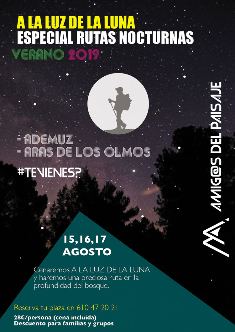 Excursión a la luz de la luna con Amigos del Paisaje Descubre la belleza del bosque valenciano en esta bonita ruta de senderismo nocturno ¿Cuándo? Fecha Del Thursday, 15 de August del 2019 al Saturday, 17 de August del 2019 HORA 19:30 h ¿Dónde? LUGAR Aras de los Olmos Placeta, 7 Ver ficha Vive la experiencia de caminar por la noche en plena naturaleza con las tres excursiones que ha organizado Amigos del Paisaje para conocer el bosque en la profundidad de la noche, bajo la luz de la luna. Los próximos 15, 16 y 17 de agosto en Aras de los Olmos y Ademuz tendrás la oportunidad de descubrir la fauna nocturna, sus sonidos, sus secretos y vivir las sorpresas que te deparan en un bosque por la noche. Si quieres conocer más rutas y excursiones como esta, consulta nuestra agenda y entérate de todos los planes para hacer este verano en València. Un recorrido ideal para locales, pero también para visitantes de València donde volver a ser niños con esta actividad de senderismo que de una forma cultural, didáctica, divertida y consciente te permite retomar ese contacto con el mundo natural que viviendo en las ciudades hemos olvidado en gran parte. Recuerda, Amigos del Paisaje organiza estas rutas los días 15, 16 y 17 de agosto pero durante todo el mes puedes reservar una experiencia nocturna para grupos, familias, amigos, etc. Para más información y reservas, contacta con Amigos del Paisaje en [email protected] o también puedes escribir un whatsapp o llamar al 610 47 20 21. Ficha técnica: Fechas: 15, 16 y 17 de agosto Dónde: Aras de los Olmos y Ademuz Lugar de encuentro: Plaza España (València) para partir en vehículos hacia el lugar Hora de encuentro: 19.30 Dificultad: Baja Tiempo aproximado de la ruta: 2 horas Público recomendado: personas adultas Precio: 28 euros (incluye cena) Artículos relacionados Realfooding en València Piscinas naturales en València Calas con encanto de la Comunidad Valenciana Snorkel en Valencia