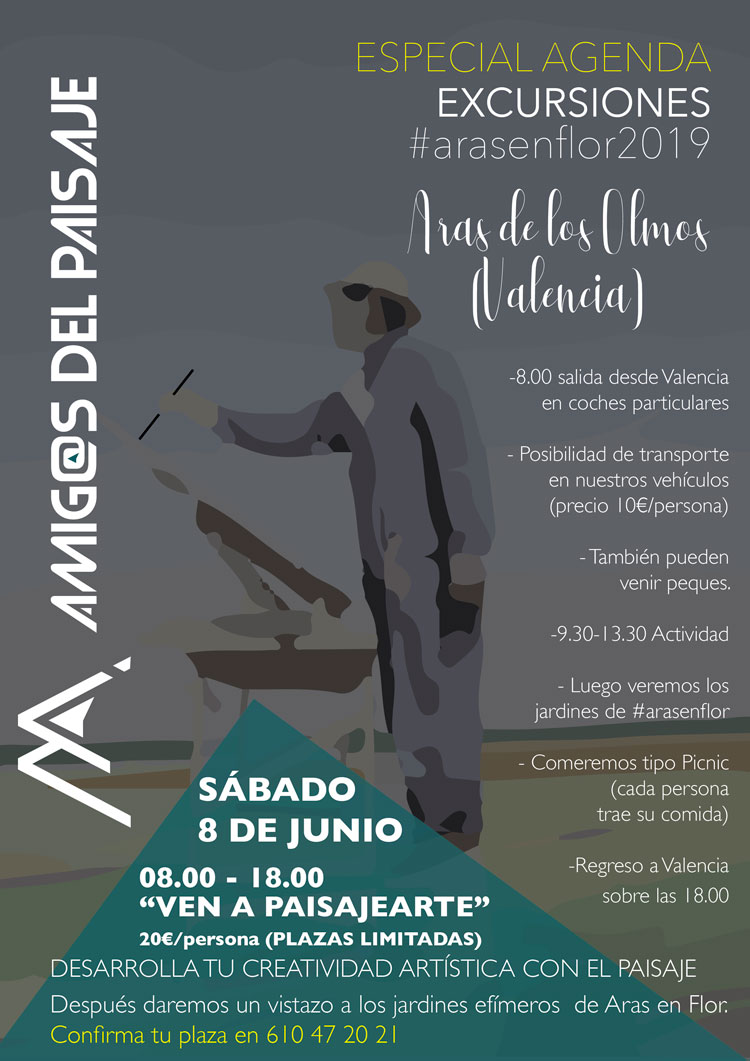 Excursión de paisaje y arte en Aras de Los Olmos Naturaleza y creatividad van de la mano en la próxima excursión de Amigos del Paisaje: "Ven a paisajearte" ¿Cuándo? Fecha Del Saturday, 08 de June del 2019 al Saturday, 08 de June del 2019 HORA 09:30 h ¿Dónde? LUGAR Aras de los Olmos Placeta, 7 Ver ficha Este próximo sábado 8 junio deja que tu imaginación fluya en una ruta creativa en Aras de Los Olmos. Si te gusta la naturaleza y quieres conocer más rutas en València como esta, consulta nuestra agenda y no te pierdas ningún plan. ¡Hay que aprovechar este tiempo al máximo! Amigos del Paisaje une el arte y el paisaje a través de una excursión donde podrás disfrutar del increíble paisaje primaveral valenciano de secano mientras dejas fluir tu inspiración. Una salida creativa de toda la mañana para personas que sienten curiosidad por empezar a pintar cuadros de paisaje, conocer gente nueva, disfrutar, crear, relajarse y aprender de manera divertida y rodeados de naturaleza. La comida será en el Picnic de Aras de Los Olmos y la excursión incluye, además, la visita al pueblo y a los Jardines Efímeros de ‘Aras en flor 2019’ Precio: Adultos: 20 euros Niños: 10 euros (de 5 a 12 años) Horario: de 9.30 a 13.30 Lugar de la excursión: Aras de los Olmos. Posibilidad de viajar desde València en la #furgopaisaje: Precio: 10€ más (hasta completar las 7 plazas) Punto de encuentro: Palacio de Congresos, València Horario de salida: 8.15 horas Horario de llegada: 18.00 horas Nivel: iniciación, personas con curiosidad o quieren descubrir esta disciplina. Para reservar puedes enviar un WhatsApp o llamar al 610 472 021 o enviar un correo electrónico a [email protected] ¡Las plazas son limitadas así que reserva ya y no te quedes sin disfrutar de este planazo! Artículos relacionados El Flea Market de Valencia Vinos valencianos que no puedes perderte Descubre Cullera Cuevas espectaculares de la Comunidad Valenciana