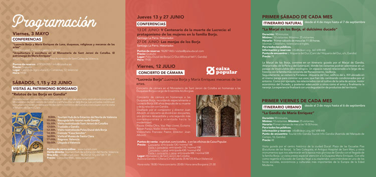 Con motivo del 500 aniversario de la muerte de Lucrecia Borgia, Turiart organiza una excursión a Gandía para conocer la historia de las Duquesas del territorio Borgia. Incluye dos visitas teatralizadas, al Monasterio de Sant Jeroni de Cotalba y al Palau Ducal dels Borja; además de la comida en un restaurante del centro histórico y un recorrido guiado por el Museo de Santa Clara.