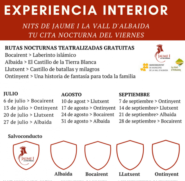 Experiencia interior con las noches de Jaume I Disfruta de rutas nocturnas teatralizadas en la comarca de la Vall D´Albaida. ¿Cuándo? Fecha Del Friday, 06 de July del 2018 al Friday, 28 de September del 2018 HORA 19:45 h ¿Dónde? LUGAR Vall D´Albaida Vall D´Albaida Ver ficha Conoce y vive la historia de Jaume I a través de rutas teatralizadas por la comarca de la Vall D’Albaida. Si quieres conocer más planes para disfrutar durante el verano en Valencia, no dudes en consultar de nuestra agenda de eventos. El programa de rutas teatralizadas, te llevará a una experiencia interior por Bocairent, Llutxent, Ontinyent i Albaida. Cuatro pueblos de la comarca de la Vall D´Albaida en los que podrás disfrutar de rutas nocturnas diferentes que te acercaran a conocer en primera persona la vida de Jaume I. Además, el itenerario de la ruta cuenta con un descanso para cenar y recargar fuerzas para lo conciertos y música de los que se podrá disfrutar al final de la noche. Si quieres asistir al evento puedes inscribirte de forma gratuita hasta las 12.00 del día anterior. Los turistas dispondrán de un salvoconducto que deberán sellar en los cuatro municipios para ser obsequiados con una “faltiquera” al final del programa. Las rutas se harán los viernes de julio a septiembre, siendo el punto de encuentro el ayuntamiento de cada municipio a las 19:45h. La visita teatralizada tendrá una duración aproximada de 1:30h. Las localizaciones y fechas exactas son las siguientes: Julio: día 6 (Bocairent), día 13 (Ontinyent), día 20(Llutxent), día 27 (Albaida). Agosto: día 10(Llutxent), día 17 (Ontinyent), día 24 (Bocairent), día 31 (Albaida). Septiembre: día 7 (Ontinyent), día 14(Llutxent), día 21 (Albaida), día 28(Bocairent). Artículos relacionados Qué hacer en Valencia Verano en Valencia Planes gratis con niños en Valencia Rutas de senderismo por Valencia
