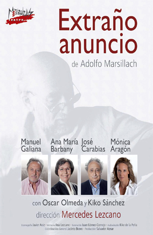Extraño anuncio El Teatre El Musical acoge sobre sus tablas "Extraño anuncio", obra de Adolfo Marsillach. ¿Cuándo? Fecha Del Wednesday, 23 de May del 2012 al Sunday, 27 de May del 2012 HORA 01:00 h ¿Dónde? LUGAR Teatro Musical del Cabanyal Plaza del Rosario, 3 Ver ficha “Extraño anuncio” llega al Teatre El Musical para contar una historia que trata de vislumbrar el misterio de estar vivos o muertos, plantea la inconsistencia de la realidad. La obra de Adolfo Marsillach juega con lo que ha ocurrido, lo que ocurre y lo que ocurrirá. Toca los terrenos de la duda y el suspense, con un toque de ironía y humor elegante. Una comedia que deja al público la tarea de encontrar la respuesta. Horarios: Miércoles, 22 h. Jueves y viernes, 21 h. Sábado 19 y 22 h. Domingo, 19 h. Precio: 10-20 €