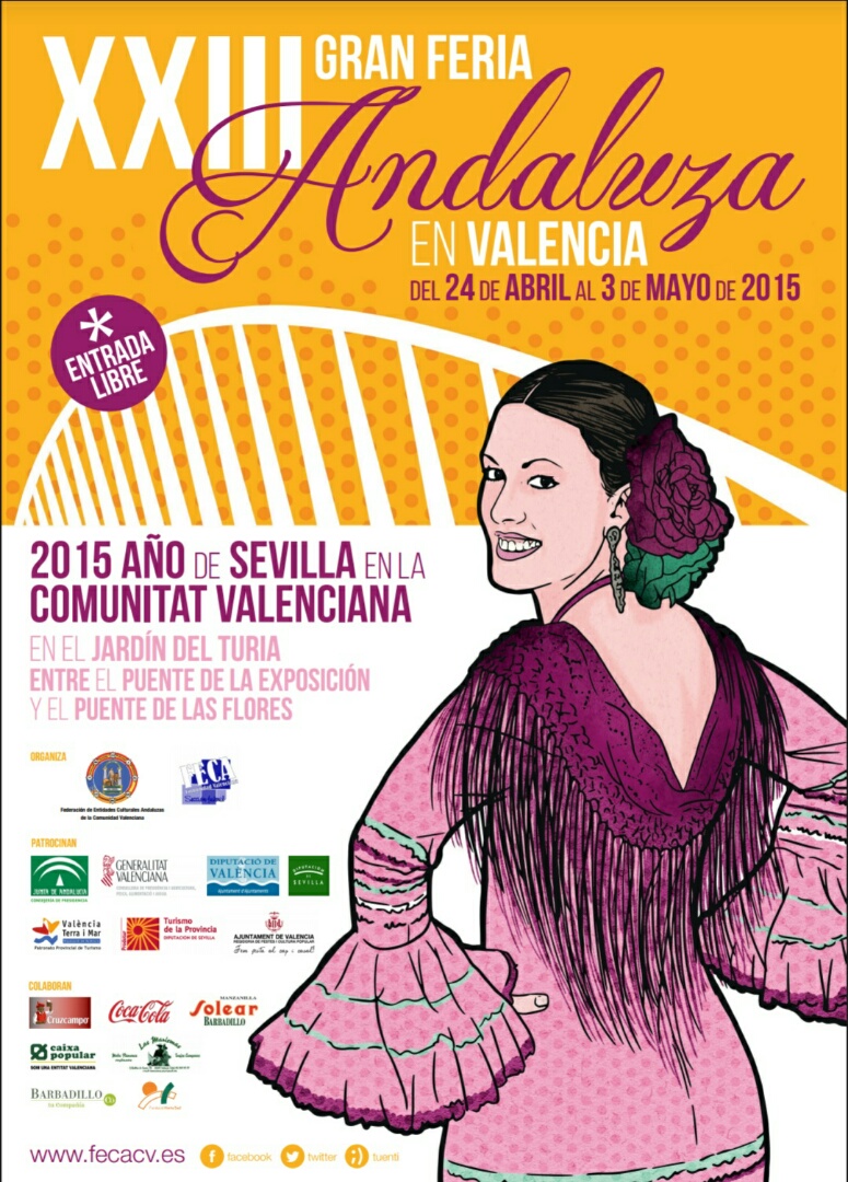La Feria Andaluza de Valencia 2015 se ubica entre el Puente de las Flores y el Puente Calatrava. La Feria de Abril de Valencia 2015, acerca las costumbre y la gastronomía andaluza a la ciudad, de la mano de los colectivos de Asociaciones de Andalucía en Valencia.