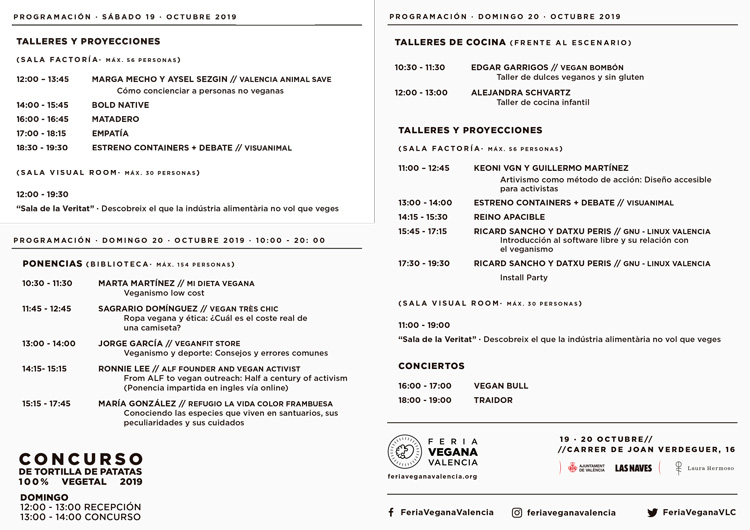 Feria Vegana de València Las Naves acogen una nueva edición de la Feria Vegana de València con talleres, charlas, proyección, puesto de comida vegana y actividades para niños ¿Cuándo? Fecha Del Saturday, 19 de October del 2019 al Sunday, 20 de October del 2019 HORA 11:00 h ¿Dónde? LUGAR Las Naves C/ de Juan Verdeguer 16 Ver ficha Los días 19 y 20 de octubre se celebra la 5ª edición de la Feria Vegana de Valencia, un evento gratuito con charlas, talleres, proyecciones y gastronomía que tiene lugar en Las Naves. Consulta la agenda de València y no te pierdas la variedad de la planes gastronómicos, ¡hay para todos los gustos! Los puestos de comida serán, de nuevo, uno de los grandes atractivos para los amantes de la gastronomía. Una vez más, estarán presentes establecimientos veganos de València y de otras provincias. Pero no solo se podrá comprar comida, sino que también habrá empresas del sector textil, complementos y serigrafía. Y para los más peques también habrá actividades infantiles tanto el sábado como el domingo. La presencia de santuarios es otro de los grandes intereses de la Feria. Este año cuenta con la participación de asociaciones y refugios que vienen desde diferentes puntos de la geografía española. Y no podía faltar la 3ª edición del Concurso de Tortilla Vegana de Patatas. Un concurso de cocina que se realiza el domingo y en el que se decidirá cuál es la mejor tortilla de patata 100% vegetal. La Feria Vegana de Valencia 2019 se celebra en Las Naves y el horario es: Sábado 19 de octubre de 11:00 a 20:00 Domingo 20 de octubre de 10:00 a 20:00 Programa Feria Vegana 2019 Artículos relacionados Monólogo de Martita de Granà: ‘Mi padre flipa’ Vuelve La Fiesta del Cine Pinktober, conciertos acústicos en Hard Rock Cafe Valencia La Plaza del Ayuntamiento de València será peatonal