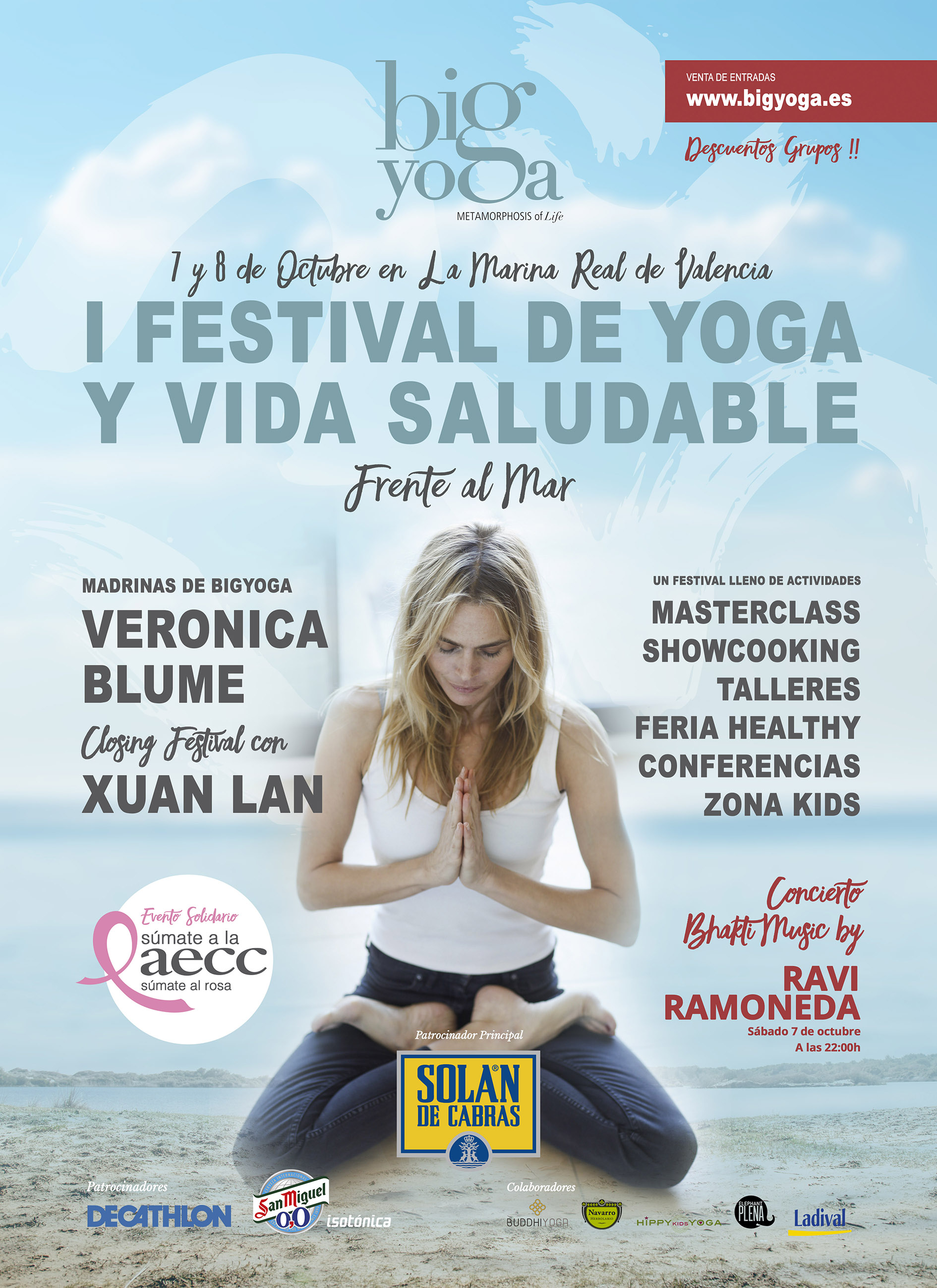 Festival Big Yoga en La Marina de València Los días 7 y 8 de octubre la Marina de València acoge un macro evento de yoga para toda la familia. Talleres, masterclass, música en directo y muchas más actividades. ¡No te lo pierdas! ¿Cuándo? Fecha Del Saturday, 07 de October del 2017 al Sunday, 08 de October del 2017 HORA 08:00 h ¿Dónde? LUGAR La Marina de València Muelle de la Aduana s/n Ver ficha El 23 y 24 de junio en la Marina Real del Puerto de Valencia se celebrará la segunda edición del Festival Big Yoga. Podréis disfrutar de la meditación, la práctica de yoga, los talleres y las actividades que te ayudarán a mejorar tu calidad de vida. Si te interesan los eventos de la ciudad consulta nuestra agenda. Se trata de un evento enfocado a las familias que quiera ir a disfrutar de este fin de semana diferente. Podrán aprender sobre alimentación saludable y desarrollo personal. Contarán con actividades de danza, música y diferentes modalidades de yoga. Participarán reconocidos profesionales de yoga dando conferencias, talleres y también showcooking. Las instalaciones están preparadas para albergar a 1.000 personas. Las variadas áreas serán: zona de feria saludable, zona de comida ecológica, zona para conferencias, zona de música en directo y zona infantil. En esta última, se ofrecerán actividades de miniyoga, mindfullness, huerto ecológico, manualidades y reciclaje. Este festival está pensado no solo para yoguis avanzados, sino también para aquellos que se están iniciando o simplemente para deportistas, amantes del desarrollo personal. Si no quieres perder la oportunidad de disfrutar de este evento de yoga en València practicar deporte al aire libre en un entorno privilegiado junto al mar, inscríbete ya en la web de Big Yoga. Las entradas se pueden adquirir en la web https://www.bigyoga.es/venta-de-entradas/ Cartel Big Yoga 2017 Artículos relacionados Planes con niños al aire libre en Valencia 7ª edición de BioCultura en Feria Valencia Marcha Ciudad de Valencia 2017 Día sin coches en València