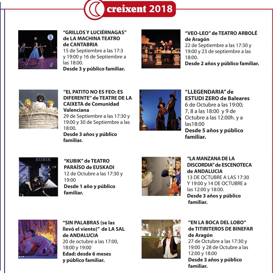 Festival Creixent Teatre en Valencia El festival teatral para niños Creixent Teatre se celebra del 17 de septiembre al 23 de octubre en el Teatret de Valencia ¿Cuándo? Fecha Del Saturday, 15 de September del 2018 al Sunday, 28 de October del 2018 HORA 12:00 h ¿Dónde? LUGAR El Teatret calle Doctor Zamenhof, 45, bajo Ver ficha Los más peques se convierten en protagonistas durante este otoño. Una de las mejores formas de disfrutar la ciudad de Valencia con niños es asistiendo al Festival Creixent Teatre 2016 que se celebra en el Teatret del 15 de septiembre al 28 de octubre. La agenda de niños en Valencia viene repleta de planes para que los reyes de la casa disfruten al máximo. Y si quieres más, echa un vistazo a nuestra agenda en Valencia. El Festival Creixent Teatre destaca por ser una cita ineludible en el teatro en Valencia y da comienzo a una nueva edición con las mejores obras de teatro infantil provenientes de cinco compañías teatrales de toda España que presentan sus creaciones, con la intención de conquistar a los más pequeños e invitarlos a que comiencen a disfrutar de este arte. Con obras como “El patito no es feo: es diferente”, “Llegendaria” o “Veo-leo”, Creixent Teatre pretende seguir consolidándose como la referencia en el teatro infantil. Te invitamos a que consultes la programación completa del Creixent Teatre 2016: En cuanto a las entradas, los precios son los siguientes: Adultos: 8 € Niños: 6 €. Información y reserva anticipada de entradas llamando al 96 382 74 43. Recogida y venta en el propio teatro 30 minutos antes de cada función. Calle Doctor Zamenhof, 45. Artículos relacionados Agenda de niños en Valencia Planes con niños al aire libre en Valencia