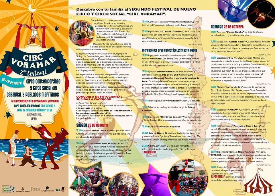 Festival de Circ VoraMar en el Cabanyal Ruta de la tapa, espectáculos y actividades gratuitas en El Cabanyal ¿Cuándo? Fecha Del Saturday, 28 de October del 2017 al Sunday, 29 de October del 2017 HORA 10:30 h ¿Dónde? LUGAR Cabanyal Cabanyal Ver ficha Llega al distrito de Poblats Marítims la segunda edición de un festival repleto de arte, humor y diversión. El festival de Circ Voramar de València tendrá lugar los días 28 y 29 de octubre y abarcará multitud de actividades. Si andas buscando qué hacer con niños en València este evento es ideal para disfrutar en familiar. Y de paso, anímate y descubre- al igual que este- otros eventos gratuitos en València. Tras el éxito de la edición pasada, el Nuevo Circo y Circo Social del Cabanyal celebra en 2017 una nueva entrega de su festival de circo. Un festival abierto y gratuito que este año contará con 15 espectáculos y 10 actividades gratuitas para todos los públicos a lo largo de los dos días. Los alrededores del barrio del Cabanyal y el recinto Municipal del Mercado del Grao serán testigos de la ilusión y la alegría que el circo hará vivir a los asistentes. Música en directo, exhibiciones, zona de descanso, pasacalles, talleres y hasta una ruta de la tapa. ”Tapanyalear” es un recorrido gastronómico a lo largo de 11 locales del barrio para degustar sabrosos aperitivos hasta el día 29. La ruta de la tapa del Cabanyal te espera con precios populares e interesantes premios. Si no quieres perderte este evento en València, echa un vistazo a la programación completa que te presentamos a continuación. Programa Festival Circ Voramar al Cabanyal 2017 SÁBADO 28 DE OCTUBRE 10.30h Pasacalles “Moon Circus Baraka” por calle Martí Grajales. Una divertida marea de circo que nos transporta por el mundo de la fantasía. Duración: 30 min. 11.00h Espectáculo “BatuClown El Espectáculo” Cía. Baraka Circ en el Parque Martí Grajales. Percusión en directo, clown, malabares, monociclo, equilibrios… de los artistas consigue el disfrute de grandes y pequeños. Todo esto se mezcla con una sencilla y al mismo tiempo divertida dramaturgia. Duración: 60 min. 12.00h Continua el pasacalle “Moon Circus Baraka”, por el interior del Mercado del Cabanyal y calle Justo y Vilar. Duración: 60 min. 13.00h Espectáculo Cía. Víctor Garmendia, en el cruce calle Justo y Vilar con calle Barraca. Showman y Malabarista de la terra Valenciana, soñando, plasmando viajes, trabajando duro y riendo, sobre todo riendo. Duración: 40 min. En el Mercado del Grao: 16.30h Espectáculo participativo para publico familiar “PercuJocs” Cía. Baraka Circ. Un novedoso formato que combina teatro y clown, con juegos participativos a ritmo de la mejor percusión en directo. Duración: 60 min. 17.30h Apertura “Mundo Baraka”, de área de talleres y actividades infantiles. Info point, Chill Circus y Zona cómoda de Descanso Familiar y parking de carritos de bebe. Escuelita de Nuevo Circo para todas las personas y personitas. Escuelita libre para los más inquietos que viendo a nuestros artistas no puedan resistir la tentación de lanzar una pelota al aire, una maza o cualquier otro objeto circense que Món Baraka Nou Circ Cabanyal tendrá preparado para ti. Duración: 17.30 a 20h. 17.30h Taller de percusión “Percutando” Green Gos Batucada. Duración: 60 min. 17.30h Taller de verticales y acrobacia a cargo de Gabriel Chemelli. Duración 60 min. 18.30h Espectáculo “Sky Circus Company” Cía Pedro Torres y Gema Escobar. Una joven compañía, con años de experiencia. Duración: 60 min. 19.30h Exhibición Green Gos Batucada. Duración: 15 min. 20.00h Gala de Nuevo Circo. Entre los límites de lo circense y lo teatral. Rueda Cyr, Aro y Telas Aéreas, Hula Hoop de LED, Malabares, Zancos Danza y Acrobacia con mucho Humor. Duración: 90 min. 21.30h Sorteo de Cenas y regalo de camisetas a los participantes en la segunda ruta de la tapa “II Tapanyalear”. Cierre del recinto del Mercado. DOMINGO 29 DE OCTUBRE 10.00h Apertura “Mundo Baraka”, de área de talleres, escuelita de circo y actividades infantiles. Info point, Chill Circus y Zona cómoda de Descanso Familiar y parking de carritos de bebe. Escuelita de Nuevo Circo para todas las personas y personitas. Escuelita libre para los más inquietos que viendo a nuestros artistas no puedan resistir la tentación de lanzar una pelota al aire, una maza o cualquier otro objeto circense que Món Baraka Nou Circ Cabanyal tendrá preparado para ti. Duración: 10 a 20h. 11.15h Espectáculo “XIRCO” Cía Gabriel Chemelli. Espectáculo de circo y teatro unipersonal. Malabarismo, acrobacia, magia y teatro se combinan en este show para divertir, emocionar y entretener al público. Duración: 40 min. 13.00h Espectáculo “Seu-Te!”, Cía. Acrobacia Mínima. Este espectáculo va más allá y trata de establecer nuevas formas de relacionarse entre los artistas y el público. Es una invitación a participar, colaborar, jugar y favorecer la aparición de situaciones que hagan de éste un trabajo colaborativo que pretende romper la barrera que hay entre el artista y el espectador, pasando a compartir el objetivo común de acompañar el espectáculo hasta el final. Duración: 50 min. 16.00h Muestra “La Mar de Circ” muestra de alumnos de Circo Social Escuela Món Baraka Nuevo Circo. Con todo lo aprendido durante el curso de verano exponemos nuestro trabajo ante el público, un auténtico espectáculo de circo lleno de color, magia, sentimientos y expresión, fruto de un buen esfuerzo grupal. Duración: 45 min. 17.00h Espectáculo “Abatido Circus” Cía. Juan Manuel Requena. Una nueva forma de entender el deporte! El tenis, el basket y el ciclismo realizado por el gran artista Abatido. ¿Sera verdad eso de “in mens sana, corpore sano”? Duración: 60 min. 18.00h Taller animación “Acércate al Circo y Juega” La escuela Mundo Baraka ofrece esta animación de formación, expresión y convivenc