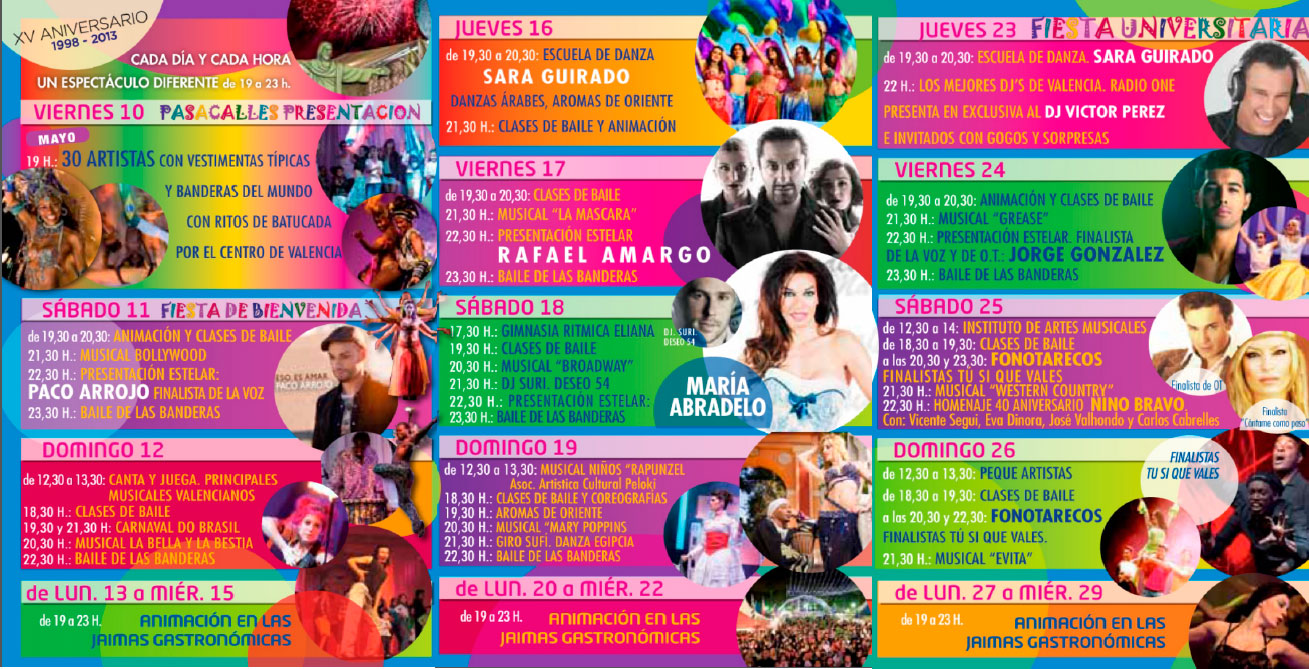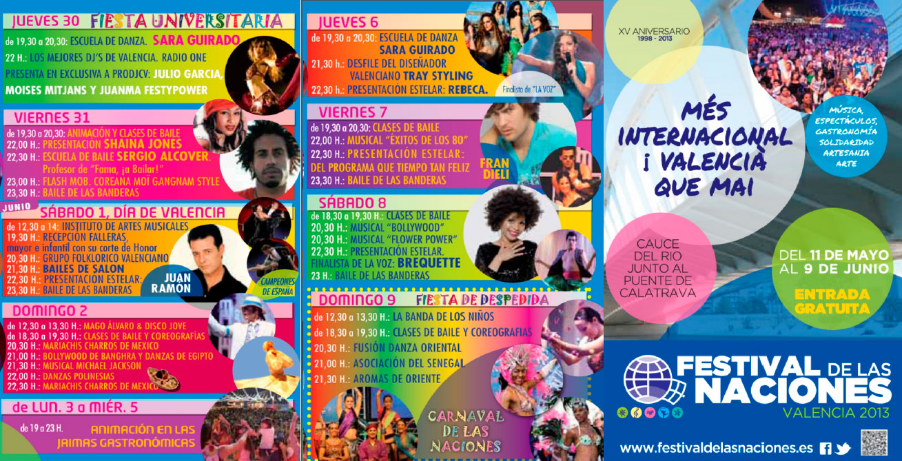 Festival de las Naciones en Valencia 2013 Un año más, vuelve a celebrarse el Festival de las Naciones en el Caude del Río Turia de Valencia ¿Cuándo? Fecha Del Tuesday, 28 de May del 2013 al Sunday, 09 de June del 2013 HORA 00:00 h ¿Dónde? LUGAR Cauce del Turia Alameda Ver ficha El Festival de las Naciones se instalará en Valencia del 11 de mayo al 9 de junio de 2013 para traer a nuestra ciudad todas las culturas de las naciones del mundo. La Feria de las Naciones estará ubicada en el Cauce del Río Turia, junto al puente de Calatrava. A continuación te dejamos toda la información de este evento: Programación de la Feria de las Naciones de Valencia Haz click en las imágenes para ver la programación del Festival de las Naciones de Valencia. ¡Y no te olvides de los jueves universitarios! Horario de la Feria de las Naciones de Valencia De lunes a miércoles: de 11 a 15 horas y de 17 a 23:30 horas; Jueves, viernes, sábados y vísperas de festivos: de 11 a 15 horas y de 17 a 00:30 horas; Domingos y festivos: de 11 a 23:30 horas. Como siempre, la entrada al Festival es gratuita. Sin duda, esto es algo que hay que ver y vivir en Valencia. Artículos relacionados La única App con agenda integrada actualizada diariamente de Valencia Qué ver en Valencia Carreras populares en Valencia