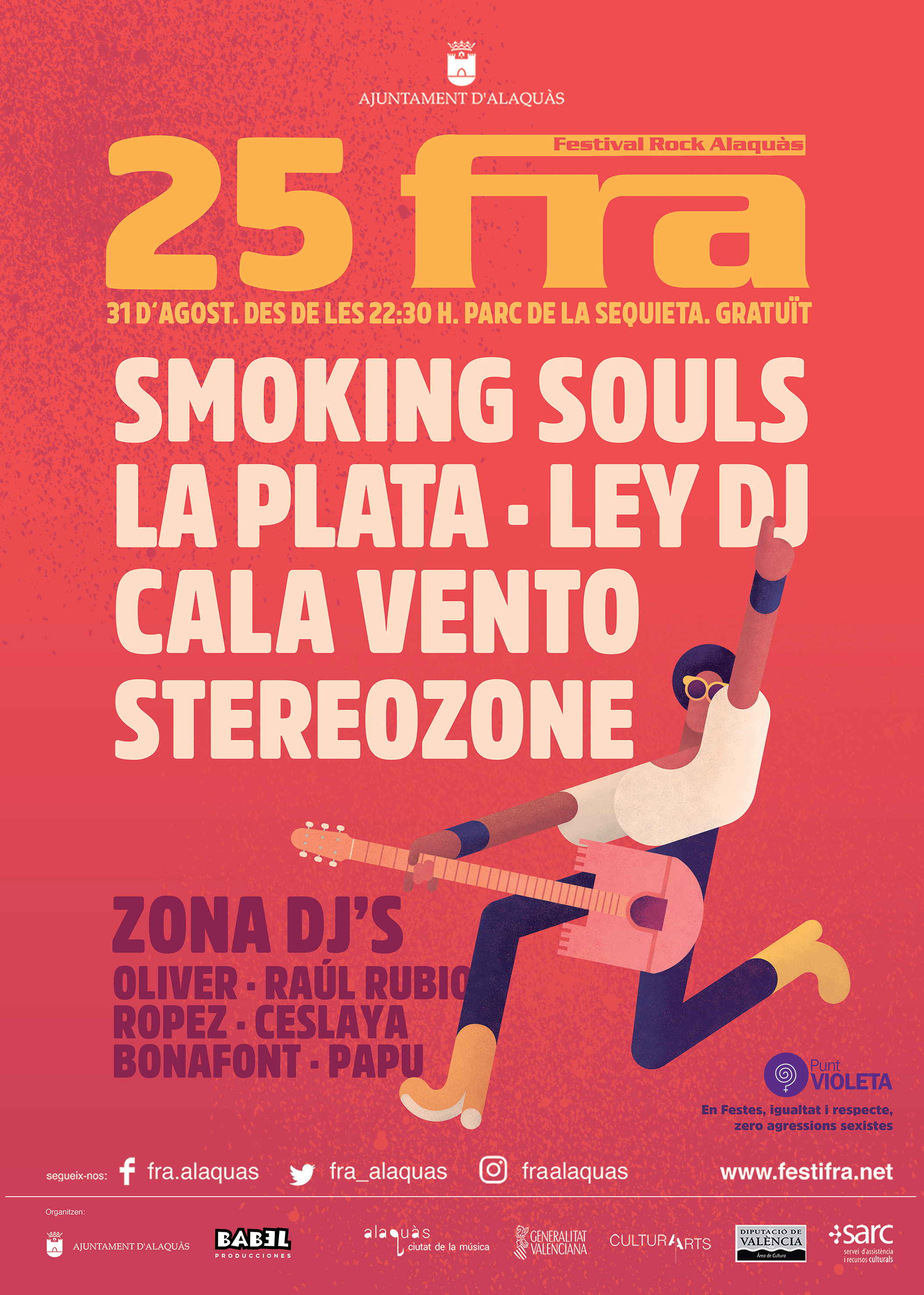 Festival de rock Alaquàs El FRA celebra su 25 aniversario cargado de buena música y grandes artistas ¿Cuándo? Fecha Del Saturday, 31 de August del 2019 al Saturday, 31 de August del 2019 HORA 22:30 h ¿Dónde? LUGAR Alaquàs Alaquàs Ver ficha El verano está repleto de conciertos que no puedes perderte. El próximo 31 de agosto tendrá lugar en el parque de la Sequieta de Alaquàs, y de forma gratuita, el 25 aniversario del Festival de Rock de Alaquás. El FRA es considerado un festival referente del estilo indie y pop-rock en Valencia, y en esta ocasión celebra 25 años, por ello, con motivo de su aniversario este año cuenta con grandes artistas y grupos. Entre ellos está la banda La Plata con un estilo pop que ha irrumpido con fuerza en festivales de todo el estado. También contarán con Cala Vento formado por dos componentes llenos de talento y que estarán en el FRA tras un verano repleto de giras. La potente banda Smoking Souls tampoco han querido perderse el evento. Por último, para finalizar la noche por todo lo alto, Ley Dj, tras participar en festivales como el FIB o Low Festival, lo dará todo hasta bien entradas las cinco de la madrugada. ¡Si quieres enterarte del mejor ocio en València y de todos los eventos gratuitos consulta nuestra agenda! Artículos relacionados Música a la Mar Concierto gratuito Maldita Nerea en Mislata Concierto de Ana Guerra y Cepeda en València Festival de hip hop en Casino Cirsa Valencia