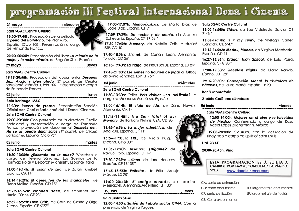 Festival Internacional Dona i Cinema Más de 20 películas de todo el mundo con la mirada de cineastas de todo el mundo ¿Cuándo? Fecha Del Tuesday, 03 de June del 2014 al Friday, 06 de June del 2014 HORA 01:00 h ¿Dónde? LUGAR SGAE Valencia calle Blanqueries, 6 Ver ficha Se celebra en Valencia la tercera edición del Festival Internacional Dona i Cinema- Mujer y Cine-Woman & Film, que acercar a la ciudad la mirada y los trabajos de mujeres cineastas nacionales e internacionales. El Festival Internacional Dona i Cinema- Mujer y Cine-Woman & Film tendrá lugar en la Sala SGAE Centre Cultural del 3 al 6 de junio, con más de 20 películas de todo el mundo. Además el Festival Internacional de Mujer y Cine 2014, cuenta con actividades extras como las master classes, debates y copas con directoras. Y sobre todo, con el ciclo previo fuera de concurso ‘MUJERES TRAS LA CÁMARA: 100AÑOS DE CINE ESPAÑOL’. Este año se rinde homenaje a Pilar Miró y a la directora alicantina Cecilia Bartolomé, madrina de esta edición. El ciclo comienza el miércoles 21 de mayo a las 18h, con la proyección de la película ‘El Perro del Hortelano’ de Pilar Miró. Siguen dos proyecciones de la película ‘Después de…’ de la madrina del festival, Cecilia Bartolomé. El día jueves 29 a las 19.15h se proyecta la segunda parte ‘Atado y bien atado’ El día 2 de junio a las 19h la primera parte ‘No se os puede dejar solos’, donde contamos con la presencia de la directora. Apertura del Festival La Sección Oficial se lanza el día 2 JUNIO a las 11:30h con la Rueda de Prensa de apertura del Festival Internacional Dona i Cinema- Mujer y Cine-Woman & Film en la Sala Berlanga del IVAC. José Luis Moreno, director de CulturArts – IVAC, Antonio Martín, director SGAE, Antonia Bueno, presidenta de la asociación DonesenArt, Giovanna Ribes, co-directora del Festival Internacional Dona i Cinema- Mujer y Cine-Woman & Film y todas las organizadoras presentarán la programación, las cineastas y todas las actividades previstas a lo largo de los cuatro días. Sección Oficial La Sección Oficial abarca todos los géneros, documental, animación y ficción, incluyendo también películas más experimentales. Contamos con grandes cineastas españolas reconocidas en los grandes festivales internacionales, como Neus Ballús (La Plaga, 2013 estrenada en la Berlinale) o Laura Mañá (Concepción Arenal, la visitadora de cárceles, 2012). Además con artistas internacionales de renombre como la alemana Jeanine Meerapfel (El Amigo Alemán, 2012.) y la libanesa Eliane Raheb (Sleepless Nights, 2012. Mejor Documental en el Birds Eye View Festival de Londres). Además el día 5 de junio a las 21:00h en el Laboratorio (Plaça Cors de la Mare de Déu, 3) hay el Café Con Directoras’, un evento-networking con las directoras que asistirán al festival. Entradas La entrada al Festival Internacional Dona i Cinema- Mujer y Cine-Woman & Film es gratuita para todas las proyecciones y todas tendrán lugar en la Sala SGAE Centre Cultural (C/ Blanquería 6 – Valencia) . Programa Una oportunidad de disfrutar de un Festival que se afianza en Valencia. *No dejes de consultar los eventos de Valencia. Artículos relacionados Teatro Valencia Eventos en Valencia Exposiciones Valencia