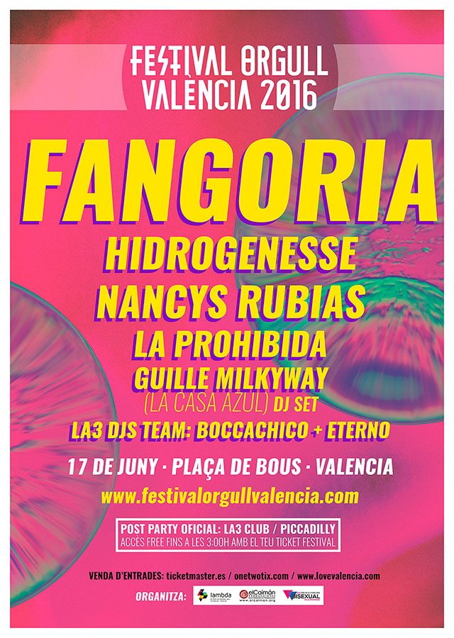 Festival Orgull València El primer festival del Orgullo LGTB en Valencia ¿Cuándo? Fecha Del Friday, 17 de June del 2016 al Friday, 17 de June del 2016 HORA 20:00 h ¿Dónde? LUGAR Plaza de Toros de Valencia C/ Xàtiva, 28 Ver ficha Comprar entradas Con motivo del Orgullo LGTB Valencia se celebra, por primera vez, un festival de música de 7 horas de duración. Consulta toda la información sobre el Día del Orgullo LGTB en Valencia y conoce también la agenda de conciertos en Valencia. Valencia se prepara para acoger, el 17 de junio en la Plaza de Toros, un multitudinario concierto del Orgullo Gay en Valencia. Un gran evento como parte del programa de actividades de la correspondiente edición del Orgullo LGTB en Valencia que se celebrará los meses de junio y julio. Festival Orgull València 2016 reunirá en una sola jornada a artistas de la talla de Fangoria, Nancys Rubias, Hidrogenesse, Guille Milkyway (La Casa Azul) Dj Set, La prohibida y La3 DJ Tema: Boccachico + Eterno. Cuando acabe, puedes pasarte por alguno de los locales gay friendly en Valencia que te animarán el resto de la noche. Y no te olvides de la Mostra La Ploma con el mejor cine LGTB. Además, el Festival Orgull València 2016 completará el cartel musical con una oferta gastronómica bajo el lema Cómete el Mundo donde siete restaurantes de Valencia ofrecerán distintas variedades gastronómicas: cocina tradicional japonesa, platos vegetarianos creativos y saludables para veganos y celíacos o suculentas hamburguesas gourmet. Escenario y precios Pista Premium | Mesa VIP Pista => 70€ Pista Frontal Escenario | Golden Ring => 35€ Pista General => 25€ Grada General => 25€ Personas Movilidad Reducida => 25€ Comprar entradas Cartel Festival Orgull València 2016 Artículos relacionados Eventos en Valencia V Edición de Mostra La Ploma organizada por Lambda Conciertos Valencia Programa del Orgullo LGTB 2016 en Valencia Primavera en Valencia Orgullo LGTB 2021 en València