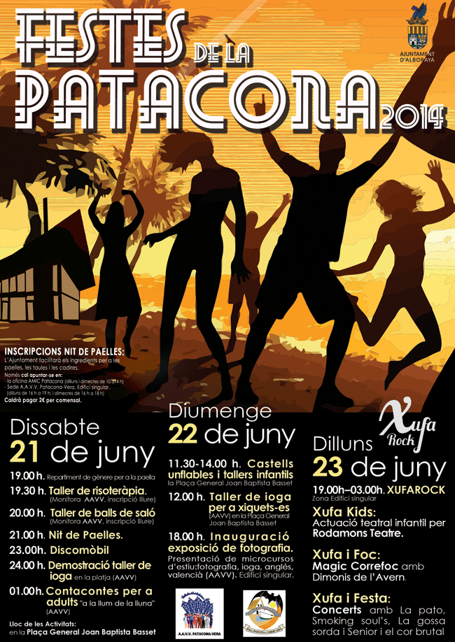 Fiestas de la Patacona 2014 La Patacona celebra unas fiestas repletas de música, gastronomía, fuegos artificiales y actividades para los niños. ¿Cuándo? Fecha Del Saturday, 21 de June del 2014 al Monday, 23 de June del 2014 HORA 01:00 h ¿Dónde? LUGAR Playa de la Patacona Pº Marítimo de la Patacona, 43, Ver ficha La Asociación de Vecinos de la Patacona- Vera con la colaboración la Falla Patacona Camí Vera y el Ayuntamiento de Alboraya organizan los días 21, 22 y 23 de junio junto al paseo marítimo de la playa de la Patacona, en Alboraya, unas fiestas junto al mar para todos los públicos. Las fiestas comienzan el sábado 21 de junio, cuando se realice el reparto de los ingredientes de la noche de paellas. Se trata de unas fiestas con música, paellas, fuegos artificiales, y actividades para niños, en las que se pretende que todos los vecinos y visitantes formen parte. Para participar en las paellas tan sólo es necesario apuntarse en las oficinas AMIC Patacona, el lunes y el miércoles de 10 a 14 horas o en la sede de la Asociación de Vecinos Patacona-Vera (AAVV), situada en el Edificio Singular, el lunes de 16 a 19 horas y el miércoles de 16 a 18 horas, el precio es de 2 euros por persona. Se facilitará los ingredientes para las paellas, además de las mesas y las sillas. Las fiestas incluyen talleres de risoterapia y bailes de salón, discomóvil, taller demostración de yoga en la playa, y cuentacuentos para adultos.. El Ayuntamiento de Alboraya prepara numerosas actividades para niños en estas fiestas de la Patacona 2014. Se instalarán castillos hinchables, habrá talleres infantil, e incluso un taller de yoga para niños. Se inaugurará una exposición de fotografía del vecino Antoni Ignaci, además la AAVV presentará sus microcursos para el verano de fotografía, yoga, inglés y valenciano. El día de San Juan 2014, se celebra un año más, el Xufa Rock 2014, un festival que promueve la huerta valenciana y sus valores como un bien intangible, y de los productos propios como la chufa, la horchata y sus derivados. Consulta el cartel Artículos relacionados Verano Noche de San Juan 2019