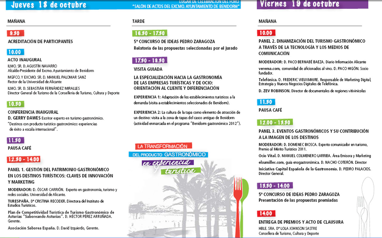 Foro Internacional de Turismo de Benidorm 2012 El Ayuntamiento de Benidorm (Alicante) acogerá los próximos 18 y 19 de octubre el XVI Foro Internacional de Turismo, que abordará la transformación del producto gastronómico en experiencia turística ¿Cuándo? Fecha Del Thursday, 18 de October del 2012 al Friday, 19 de October del 2012 HORA 00:00 h ¿Dónde? LUGAR Benidorm Benidorm Ver ficha El Ayuntamiento de Benidorm (Alicante) acogerá los próximos 18 y 19 de octubre el XVI Foro Internacional de Turismo, que abordará la transformación del producto gastronómico en experiencia turística. A lo largo de las jornadas, destinos turísticos de referencia nacional e internacional compartirán su visión innovadora de la gastronomía como motor del crecimiento económico y vehículo de difusión de la cultura autóctona, de la imagen y la competitividad del territorio. Asimismo, empresas líder en turismo gastronómico debatirán sobre el papel de los eventos, las nuevas tecnologías y canalesen la dinamización, promoción y comercializaciónde sus productos. Como ya se contempló en la edición anterior, el Foro se abre a la ciudad de Benidorm, ciudad turística por excelencia, mediante el desarrollo de una ruta que recorrerá diferentes experiencias turísticas que basan su modelo de negocio en la gastronomía. Culminará con la presentación de las propuestas finalistas del 5º Concurso de Ideas “Pedro Zaragoza” bajo el lema “Saborea el Turismo en Benidorm: propuestas creativas de turismo gastronómico”, que cada año sitúa a este destino como objeto de experimentación, ensayo y reflexión de las mentes más creativas. Consulta la programación Artículos relacionados I Ruta de la Tapa de Moncada De tapas por Valencia Japan Week Valencia 2012 Deleste Festival Valencia 2012