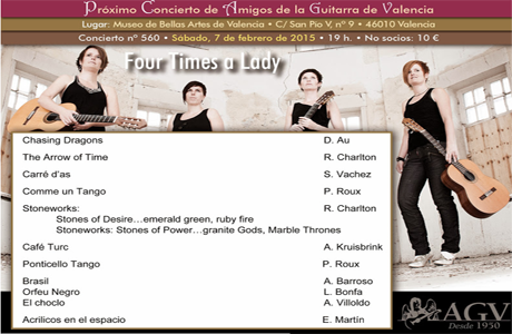 Four Times a Lady en concierto El sábado 7 de febrero es la actuación de este grupo belga en el Museo de Bellas Artes de Valencia ¿Cuándo? Fecha Del Saturday, 07 de February del 2015 al Saturday, 07 de February del 2015 HORA 19:00 h ¿Dónde? LUGAR Museo de Bellas Artes San Pío V C/ de Alboraya, 9 Ver ficha El cuarteto de guitarras Four Times a Lady actúa este sábado 7 de febrero en el Museo de Bellas Artes de Valencia. Disfruta de toda la agenda de Valencia. La asociación Amigos de la Guitarra de Valencia es la encargada de organizar este increíble concierto de guitarra. Se trata de la primera actuación en España de este grupo belga integrado solo por mujeres. Las guitarristas son: Veerle D’Hoest, Willemijn Vermeir, Leen Langenbick y Tania D’Hoest. Horario y lugar El concierto del grupo Four Times a Lady es el sábado 7 de febrero a las 19:00 en el Museo de Bellas Artes de Valencia. El precio de las entradas para aquellos que no sean socios de Amigos de la Guitarra de Valencia es de 10 euros. No te pierdas los mejores conciertos en Valencia. Artículos relacionados Invierno Carnaval en Valencia Descubre la oferta cultural de Valencia