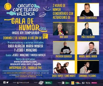 Gala apertura Circuito Café Teatro en La Rambleta Gala de Humor el 2 de octubre para iniciar la XVI Temporada de Circuito Café Teatro en Valencia ¿Cuándo? Fecha Del Sunday, 02 de October del 2016 al Sunday, 02 de October del 2016 HORA 20:00 h ¿Dónde? LUGAR La Rambleta Bulevar Sur esquina C/ de Pío IX Ver ficha Comprar entradas Circuito Café Teatro inicia su XVI temporada con una gala de humor en La Rambleta el domingo 2 de octubre a las 20:00 horas. Como cada año desde hace ya 16 años, el Circuito Café Teatro Valencia prepara con fuerza su regreso con una gala de humor que promete estar cargada de risas. Circuito Café Teatro Valencia presenta un multiespectáculo de 120 minutos de humor donde se podrá ver en directo fragmentos de algunos espectáculos que pasarán luego por los locales del Circuito durante octubre y noviembre y con la colaboración de cómicos asiduos al Circuito. Presentada por los actores y directores del Circuito Rafa Alarcón y María Minaya y la colaboración de Jesús Manzano y Mireia Navaza -encargados del guión-, nos ofrecerán una tarde-noche trepidante con la participación de los siguientes artistas del humor: Óscar Tramoyeres, Miki Dkai, Paco Enlaluna (ganador 1er concurso 2016), Patricia Sornosa (Ganadora 2º premio concurso 2016), Diego Varea y Simó Martí, Miguel Ángel Marín y Emmanuel Vizcáino. Horario y entradas La Gala de apertura Circuito Café Teatro 2016 se celebra en La Rambleta el próximo domingo 2 de octubre. El precio de las entradas para ver a estos artistas con sus mónologos en Valencia es de 12 euros con entrada anticipada y 14 euros en taquilla. Compra ya tu entrada y disfruta de una gran noche de humor. Comprar entradas Artículos relacionados Otoño Mamma Mía! El Musical en el Teatro Principal Monólogos Valencia Concierto de Film Symphony Orchestra en Valencia