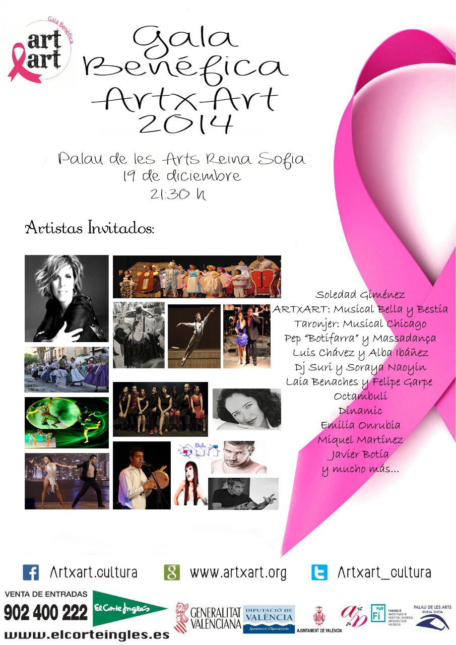 Gala benéfica ArtxArt El 19 de diciembre a las 21:30 horas se celebra una gala con fines benéficos organizada por la Asociación sin ánimo de lucro ArtxArt ¿Cuándo? Fecha Del Friday, 19 de December del 2014 al Friday, 19 de December del 2014 HORA 21:30 h ¿Dónde? LUGAR Palau de les Arts Reina Sofía Avda. del Profesor López Piñero, 1 Ver ficha La Asociación Valenciana sin ánimo de lucro ArtxArt organiza, gracias a la colaboración de la Diputación Provincial, una gala benéfica en el Palau de les Arts Reina Sofía de Valencia, el viernes 19 de diciembre a las 21:30 horas. ¡No faltes a esta cita con la solidaridad! yno dejes de consultar la Agenda de Valencia. Qué es ArtxArt ArtxArt se fundó en 2013 por un grupo de amigos que pretenden fomentar la solidaridad a través del arte, la cultura, el deporte y las artes escénicas en general. ArtxArt cuenta con miembros de todas las edades, de 7 a 67 años, con un vínculo común promover la cultura en un formato de carácter benéfico. Tras varias producciones de éxito y contando con la ayuda de instituciones y organizaciones, han conseguido importantes beneficios que han donado a las diferentes organizaciones colaboradoras: Caritas, Manos Amigas, AECC, ETC. Gala Benéfica La gala benéfica de ArtxArt está compuesta por actuaciones musicales, teatrales, circenses y de magia, sin olvidarnos de audiovisuales y humorísticos. No podrá faltar igualmente la participación y presencia del folklore valenciano tan arraigado en nuestra comunidad. Artistas: Soledad Giménez Emilia Onrubia ArtxArt Botifarra y Massadança Luis Chávez y Alba Ibañez Asociación el Taronjer Miguel Martinez Pedro DJ. Suri y Soraya Naoyin Magia Escuela de Circo DINAMIC Octámbuli Cartel: Venta de Entradas Puedes comprar tus entradas en la web y en los puntos de venta del Corte Inglés: Adquiere tus entradas online Cuenta corriente para la Fila 0: 3159-0027-41-2317260210 Subasta Benéfica Paralelamente a la celebración del evento tendrá lugar una Subasta Benéfica de artículos de relevancia donados por personajes famosos y de reconocido prestigio, cuya ganancia será donada íntegramente para la Fundació d’Investigació Hospital General Universitari de València y que comenzará semanas antes de la gala. Los artículos donados para la subasta se anunciarán en la página web de la Asociación, Únicamente se podrá pujar por ellos a través de la página web en cuestión para asegurar así un correcto funcionamiento del proceso y una transparencia escrupulosa, acorde a los valores de ArtxArt. Artículos relacionados Navidad 2024 en Valencia Eventos en Valencia Exposiciones Valencia