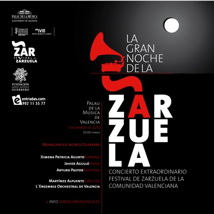 Gran Noche de la Zarzuela La zarzuela es la protagonista del Palau de la Música de Valencia. ¿Cuándo? Fecha Del Thursday, 01 de March del 2012 al Thursday, 01 de March del 2012 HORA 20:00 h ¿Dónde? LUGAR Palau de la Música Pº Alameda, 30 Ver ficha Concierto Extraordinario del Festival de Zarzuela de la Comunidad Valenciana en homenaje a Jacinto Guerrero y en colaboración con su Fundación. Más info: www.zarvalencia.es Artículos relacionados Programación Palau de la Musica: marzo 2012
