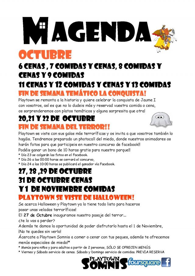 El mes de octubre en Playtown han preparado una programación cargada de diversión. Por un lado, se celebrará el 9 de Octubre y por otro lado se celebrará Halloween. Las comidas y cenas del mes estarán más tematizadas que nunca.
