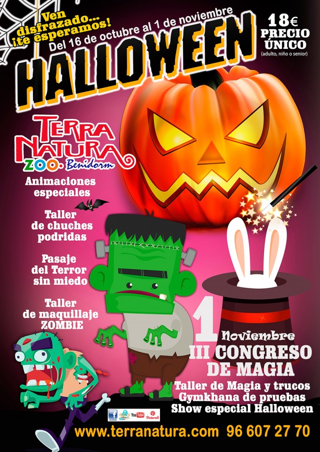 Halloween en Terra Natura Vive el Halloween más terrorífico en Terra Natura Benidorm ¿Cuándo? Fecha Del Friday, 16 de October del 2015 al Sunday, 01 de November del 2015 HORA 10:30 h ¿Dónde? LUGAR Terra Natura Foia del Verdader 1 Ver ficha Comprar entradas Se acerca el día más terrorífico del año y este año Terra Natura lo celebra por todo lo alto. Del 16 de octubre al 1 de noviembre el parque de naturaleza y animales de Benidorm se transforma para vivir este Halloween 2015 como nunca antes lo habías visto. Consulta más planes en la agenda de Valencia. Trucos de magia, pasaje del terror sin miedo, talleres de maquillaje, gymkhana y animaciones de calle recibirán a los visitantes que se acerquen a Terra Natura Benidorm. El complejo ha organizado un completo programa de actividades orientadas al público familiar para vivir la festividad de Halloween de una manera inolvidable y única. Las instalaciones del parque de animales se transformarán; los cuidadores proporcionarán calabazas a los elefantes o rinocerontes mientras que los tigres que tendrán calabazas rellenas de carne con motivo de la fiesta de Halloween. Entre las actividades de Halloween en Terra Natura destaca el pasaje de terror que se ubicará en el interior del volcán de Pangea. Además hay actividades para niños como el taller de maquillaje zombie o en el taller de chucherías podridas. La programación incluirá el desarrollo de distintas animaciones de calles, creadas especialmente con motivo de la celebración de Halloween. Las jornadas de entretenimiento culminarán con la organización del III Congreso de Magia, que tendrá lugar el 1 de noviembre y en el que se realizarán diversos talleres de magia y trucos, así como una gran gymkhana. El horario de Terra Natura durante estos días es de 10:30 hasta las 18:00 horas. El precio de entrada durante estos días de Halloween tendrá un precio especial de 18 euros. El precio es el mismo para adultos, niños y seniors. Artículos relacionados Halloween en València Tiendas de disfraces en Valencia Especial programación de Cine de Terror en Halloween Recetas de Halloween