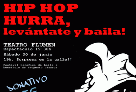 Hip Hop Hurra en el Teatro Flumen Hip Hop Hurra levántate y baila en el Teatro Flumen ¿Cuándo? Fecha Del Saturday, 30 de June del 2012 al Saturday, 30 de June del 2012 HORA 19:00 h ¿Dónde? LUGAR Teatro Flumen C/ de Gregorio Gea, 15 Ver ficha Festival benéfico para el Proyecto Lazarus. A las 19.00 horas sorpresa en la calle y a las 19.30 horas empieza el festival. El donativo es de 5 euros, y se pueden conseguir las entradas en la tienda Formigueta, en la C/Jesús 118. Artículos relacionados Poliniza, festival de arte urbano en Valencia Cine de verano 2012 en el Teatro Flumen