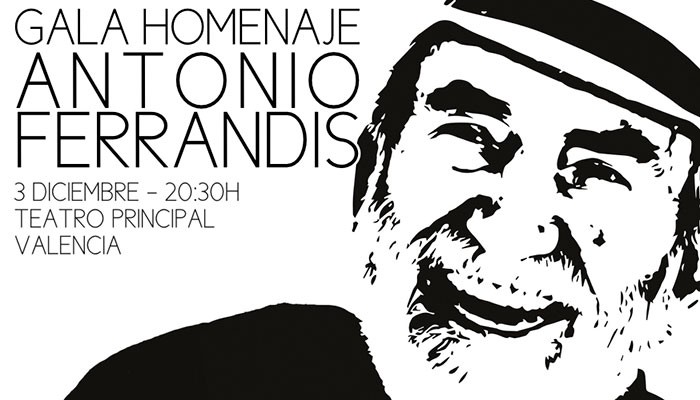 Homenaje a Antonio Ferrandis en el Teatro Principal El Teatro Principal homenajea la figura del actor Antonio Ferrandis en el 15º aniversario de su muerte con una gala llena de música y teatro ¿Cuándo? Fecha Del Thursday, 03 de December del 2015 al Thursday, 03 de December del 2015 HORA 20:30 h ¿Dónde? LUGAR Teatro Principal de Valencia C/ de las Barcas Ver ficha El Teatro Principal de Valencia alberga el 3 de diciembre una gala homenaje a Antonio Ferrandis cuando se cumplen 15 años de su muerte. ¿No sabes qué hacer en Valencia? Consulta nuestra agenda de Valencia con toda la información que necesitas sobre eventos en Valencia. Este homenaje a la trayectoria del actor Antonio Ferrandis cuenta con actores, humoristas, cantantes, directores y personalidades destacadas de muchos ámbitos que se unen para, a través de la música, el teatro, el audiovisual y los testimonios, recordar la obra de esta personalidad valenciana. La entrada para este homenaje a Antonio Ferrandis vale 10 euros que irán destinados íntegramente a la Asociación Proyecto Lázarus, dedicada a la investigación de lesiones medulares. Artículos relacionados Teatro Principal de Valencia Otoño Agenda de niños en Valencia