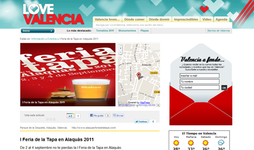 I Feria de la Tapa en Alaquàs 2011 ¿Cuándo? Fecha Del Friday, 02 de September del 2011 al Sunday, 04 de September del 2011 HORA 00:00 h ¿Dónde? LUGAR El Parque de la Sequieta de Alaquàs El Parque de la Sequieta de Alaquàs Ver ficha Durante los días, 2, 3 y 4 de Septiembre los hosteleros de Alaquàs, con el patrocinio de Mahou y la colaboración del Ayuntamiento de Alaquàs, han preparado la I Feria de la Tapa. Un evento gastronómico sin precedentes en la localidad que pretende dar a conocer y fomentar la hostelería local. Los restaurantes participantes y más información en la I Feria de la Tapa de Alaqùas.