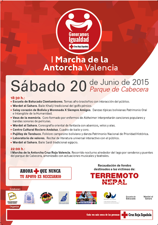 Cruz Roja de Valencia organiza el sábado 20 de junio a partir de las 18:30h la I Marcha de la Antorcha, una jornada de música, exposiciones y actividades infantiles gratuitas en la que los fondos que se recauden irán destinados a las víctimas del terremoto en Nepal. Consulta en la agenda de Valencia toda la información sobre eventos en Valencia.