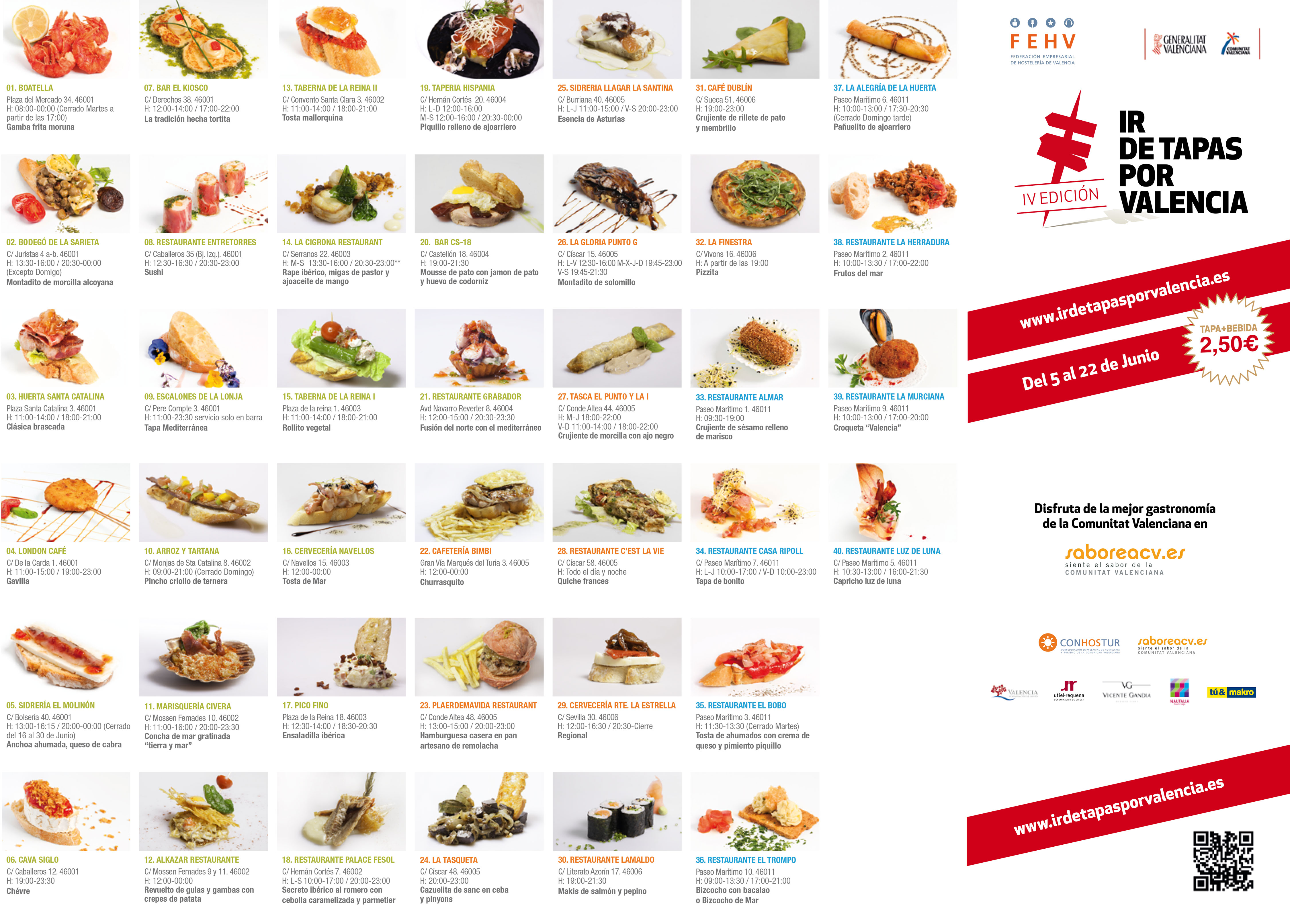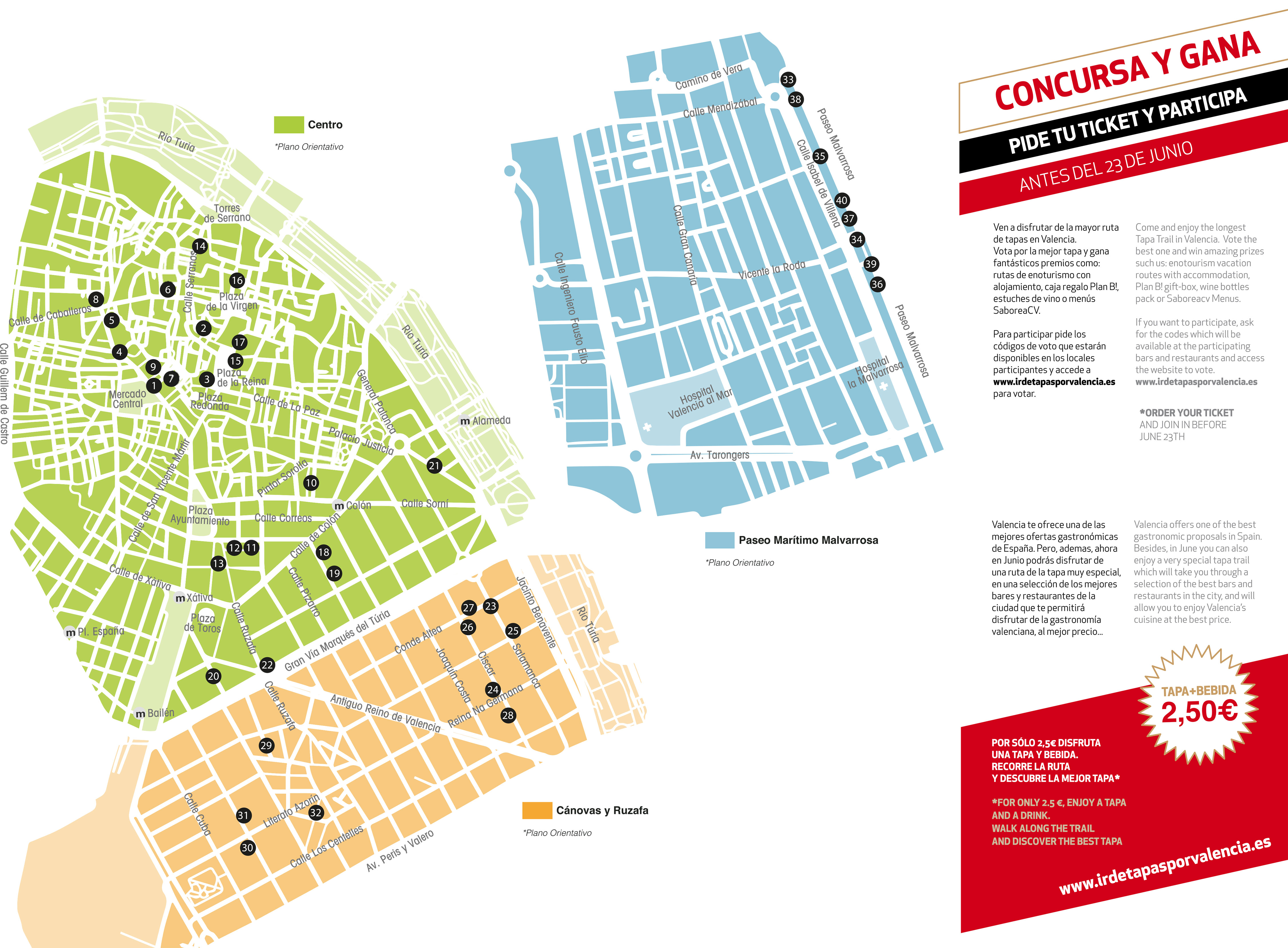 IV Edición Ir de Tapas por Valencia Valencia acoge la IV Edición Ir de Tapas por Valencia ¿Cuándo? Fecha Del Thursday, 05 de June del 2014 al Sunday, 22 de June del 2014 HORA 01:00 h ¿Dónde? LUGAR Valencia Valencia Ver ficha Valencia acoge desde hoy 5 de junio y hasta el próximo 22 de junio la IV Edición de la campaña Ir De Tapas por Valencia organizada por la Federación Empresarial de Hostelería de Valencia (FEHV) y la Confederación Empresarial de Hostelería y Turismo de la Comunidad Valenciana (CONHOSTUR) en colaboración con la Agencia Valenciana de Turismo en la que participan 40 bares y restaurantes de la ciudad de Valencia. El certamen Ir De Tapas por Valencia funcionará de lunes a domingo y en esta edición el formato se presenta como Tapa + Bebida por 2,5 euros y permitirá degustar la tapa por Valencia con bebida (agua, cerveza, refresco o copa de vino valenciano), contando para ello en esta edición con la colaboración por primera vez de la DO Valencia y la DO Utiel-Requena para promocionar también de esta forma los vinos valencianos. La iniciativa Ir de Tapas por Valencia cuenta con un total de 40 bares y restaurantes valencianos y se desarrollará en la ciudad de Valencia en las zonas del centro, Ruzafa, Cánovas y el paseo marítimo de la Malvarrosa. Los participantes podrán organizar su propia ruta para degustar las tapas de Valencia con toda la información de las rutas y de los diferentes locales y se recoge en el gastromapa de Valencia. Además los clientes que acudan a los establecimientos podrán votar la mejor tapa de Valencia a través de la página web y participarán en el sorteo de premios. La IV Edición Ir de Tapas por Valencia se celebra del 5 al 22 de junio en 40 locales de Valencia con un formato de tapa y bebida por 2’5 euros. ¡Una experiencia gastronómica, que no te puedes perder! Artículos relacionados VII Festival del Mediterrani 2014 15K Nocturna Valencia 2014 Feria Alternativa Valencia 2014