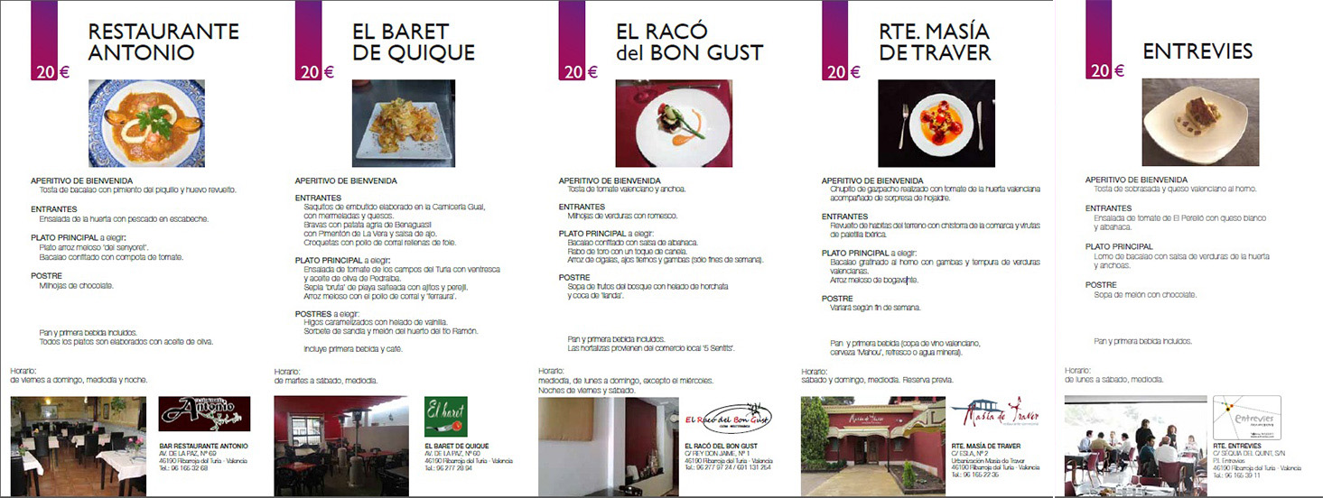 Riba-roja del Túria organiza estas jornadas gastronómicas con el fín de promover la cocina valenciana autóctona y de calidad. El punto en común es poner en valor los productos gastronómicos de la zona, darlos a conocer y sobre todo degustarlos en sus sinfín de posibilidades. Los menús están compuestos por aperitivo, entrante, plato principal y postre. El precio de cada uno es de 22 euros, de los cuáles 2 euros serán destinados a una causa solidaria.