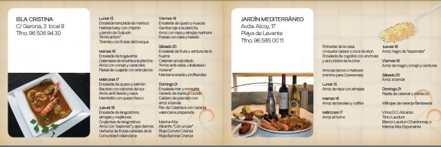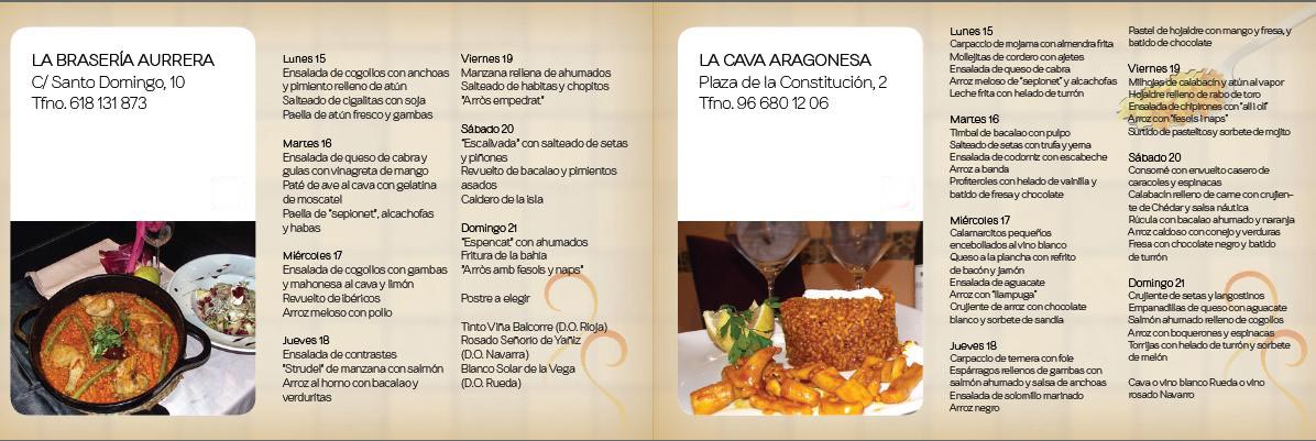 Jornadas de arroces de Benidorm 2012 Benidorm ha iniciado las primeras jornadas de los arroces donde podrás disfrutar de las mejores recetas del 15 al 21 de octubre, con este ingrediente como protagonista ¿Cuándo? Fecha Del Monday, 15 de October del 2012 al Sunday, 21 de October del 2012 HORA 00:00 h ¿Dónde? LUGAR Benidorm Benidorm Ver ficha Se van a celebrar las primeras jornadas de arroces de Benidorm, del 15 de octubre al 21 de octubre podrás disfrutar de numerosas recetas que utilizan como ingrediente principal el arroz. Por tan sólo 20 euros podrás degustar las magnificas recetas que los restaurantes de Benidorm han preparado. Restaurantes participantes: El arroz es uno de los principales diferenciales de la tierra de Valencia, por ello en la localidad alicantina han decidido rendirle un homenaje y dedicarle toda una semana. Nos podemos encontrar toda clase de arroces: arroces secos, caldosos y melosos, de carne, de pescado o mixtos, cocinados con las joyas de nuestra huerta o las maravillas de nuestra mar. Una semana en la que arroz, en caldero, en paella o en cazuela, dará fuste a ese lugar destacadísimo que, durante todo el año, ocupa entre el resto de nuestros atractivos gastronómicos. Algunas de los menús que podemos degustar: Artículos relacionados I Ruta de la Tapa de Moncada De tapas por Valencia Rutas guiadas por la huerta de Valencia Curso de Horticultura en el Botánico de Valencia