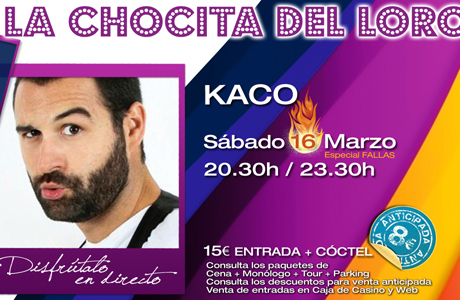 Kaco en el Casino Cirsa de Valencia Noches de risas en marzo de 2013 en Valencia ¿Cuándo? Fecha Del Saturday, 16 de March del 2013 al Saturday, 16 de March del 2013 HORA 20:30 h ¿Dónde? LUGAR Casino Cirsa Avda. de las Cortes Valencianas, 59 Ver ficha El próximo 16 de marzo de 2013 tendrás la oportunidad de disfrutar de un espectáculo muy especial en el Casino Cirsa de Valencia. Kaco hará reír al público de Valencia. Kaco, humorista madrileño, comenzó su carrera cómica en 2006. Ha pasado por la Paramount Comedy, además de ejercer como guionista de personajes del mundo del cine y la televisión como Santiago Segura (Sabías a lo que venías), José Luis Moreno (Noche Sensacional) y Los Teletubbies (en su temporada 20, el capítulo El desenlace). La entrada cuesta 15 euros y el evento empieza a las 20:30 y a las 23:30 horas. Este 2013 los monólogos en Valencia quieren ser mejores que nunca. Además, hay otros muchos eventos en la ciudad que prometen entretenerte. Valencia y el ocio están in love! Artículos relacionados Fallas 2013 Semana Santa Marinera 2013 Love Valencia App, aplicación destacada en Apple Store