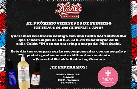 Kiehl’s Colón celebra su primer aniversario en Valencia Kiehl’s te invita a celebrar el 28 de febrero el primer aniversario de su tienda en la calle Colón 54 ¿Cuándo? Fecha Del Friday, 28 de February del 2014 al Friday, 28 de February del 2014 HORA 18:00 h ¿Dónde? LUGAR Kiehl’s Colón Valencia Calle de Colón, 54 Valencia Ver ficha En Kiehl’s están de celebración, su tienda de cosmética en Valencia Kiehl’s Colón cumple un año y para celebrarlo van a organizar una fiesta “Afterwork” en su boutique de la calle Colón 54 de Valencia con un catering a cargo del restaurante japonés de Valencia Miss Sushi. Kiehl’s, la marca de cosméticos estadounidense especializada en productos para el cuidado de la piel, el cuerpo y el cabello. Es conocida por crear productos unisex para pieles sensibles eficaces para el rostro, el cuerpo y el cabello, utilizando siempre el máximo número de ingredientes naturales combinados con la mayor innovación científica. Los productos de Kiehl’s persiguen respetar, restablecer y reforzar la barrera de la piel, consiguiendo que esté más joven, radiante y saludable. Tal es el compromiso con la salud de la piel que Kiehl’s garantiza que ésta luzca más joven y revitalizada en tan solo 28 días. Además todas las compras que realices el 28 de febrero,en la tienda de cosmética de Valencia, Kiehl´s Calle Colón 54, serán recompensadas con un regalo y podrás probar su último lanzamiento Powerful Wrinkle Reducing Cream.