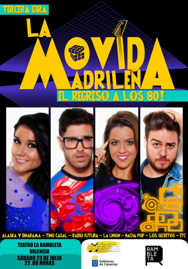 La Movida Madrileña en Valencia El 23 de julio llega la Movida Madrileña a La Rambleta de Valencia ¿Cuándo? Fecha Del Saturday, 23 de July del 2016 al Saturday, 23 de July del 2016 HORA 22:00 h ¿Dónde? LUGAR La Rambleta Bulevar Sur esquina C/ de Pío IX Ver ficha Comprar entradas La Rambleta acoge el sábado 23 de julio a las 22:00 horas ‘La Movida Madrileña. El regreso a los 80‘, un espectáculo en el que se rendirá tributo a esta época a través de un recorrido teatral y musical. Si quieres estar informado sobre todas las obras de teatro en Valencia, consulta la Agenda de Valencia En el espectáculo de La Movida madrileña se hará un repaso por las canciones que marcaron toda una década como Alaska, Hombres G, Nacha Pop, Tino Casal, La Unión y muchos más. El musical de la Movida Madrileña está integrado por una banda de cinco músicos que forman parte de una producción que ha sido alabada por la crítica. La Movida Madrileña cuenta con un guión teatral donde cuatro cantantes harán un viaje en el tiempo hasta la década de los 80 a través de sus personajes. Puedes comprar las entradas para el Musical de la Movida Madrileña en La Rambleta en el botón ‘Comprar entradas’ que aparece justo debajo del mapa desde 15€. Sorteo Love Valencia Del viernes 1 de julio al domingo 3 de julio, Love Valencia organiza un sorteo de entradas para el musical La Movida Madrileña. Se sorteará una entrada doble para el concierto que tiene lugar el sábado 23 de julio en La Rambleta. ¿Qué tienes que hacer para participar? 1º Dejar un comentario en esta publicación diciéndonos cuál es tu canción preferida de la movida madrileña. 2º Compartir la publicación (¡Recuerda! Para que sea válido la publicación debes que compartirla de forma pública). ¡No te pierdas este musical en Valencia y disfruta de todo lo que te ofrece el verano en Valencia. Cartel Artículos relacionados Verano Concerts de Vivers 2023
