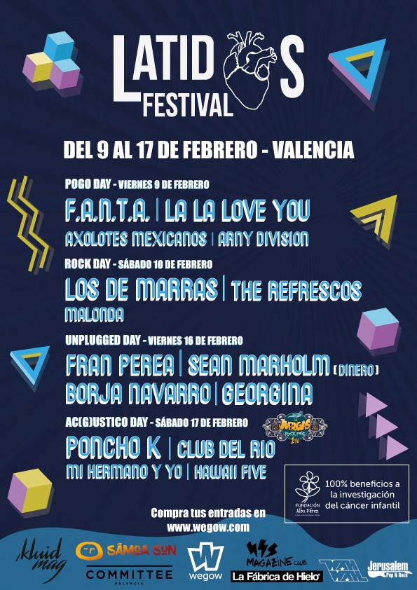 Latidos Festival 2018 en Valencia Un festival de música para recaudar fondos contra el cáncer infantil. Latidos Festival se celebra 4 días en 4 locales distintos con 4 estilos de música. ¡Variedad y calidad! ¿Cuándo? Fecha Del Friday, 09 de February del 2018 al Saturday, 17 de February del 2018 HORA 18:00 h ¿Dónde? LUGAR Valencia Valencia Ver ficha La ciudad de Valencia se prepara para acoger la V edición del Latidos Festival, un festival de música en Valencia que en 2018 tendrá lugar del 9 al 17 de febrero. Y si buscas más planes porque no sabes qué hacer en Valencia estos primeros meses del año, consulta nuestra agenda de Valencia y disfruta del ocio en Valencia. Esta iniciativa solidaria se consolida año tras año por una buena causa: luchar contra el cáncer infantil. El 100% de los beneficios del festival se donan a la investigación a través de la fundación Alba Pérez. El ciclo de conciertos en Valencia se reparte en 4 días; concretamente los días 9, 10, 16 y 17 de febrero. Cada uno de estos días los conciertos se celebran en un sitio distinto (La Fábrica de Hielo, Sala Jerusalén, Sala Wah Wah y Magazine Club) y el estilo de música también es diferente: hay espacio para el punk-pop, el rock nacional, el folk y hasta la fusión sureña. Artistas como Fran Perea, Los de Marras, F.A.N.T.A., La La Love You, The Refrescos, Malonda y Poncho K se unen para participar en este eventazo. Para aquellas personas que deseen colaborar pero no puedan acudir, se ha habilitado una fila 0 a un precio de 5 euros. Consulta más abajo el cartel y no te pierdas este festival solidario en València con su ecléctica programación. Programación Latidos Festival 2017 Artículos relacionados Invierno Programa de Fallas 2018