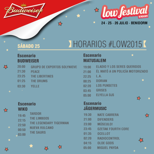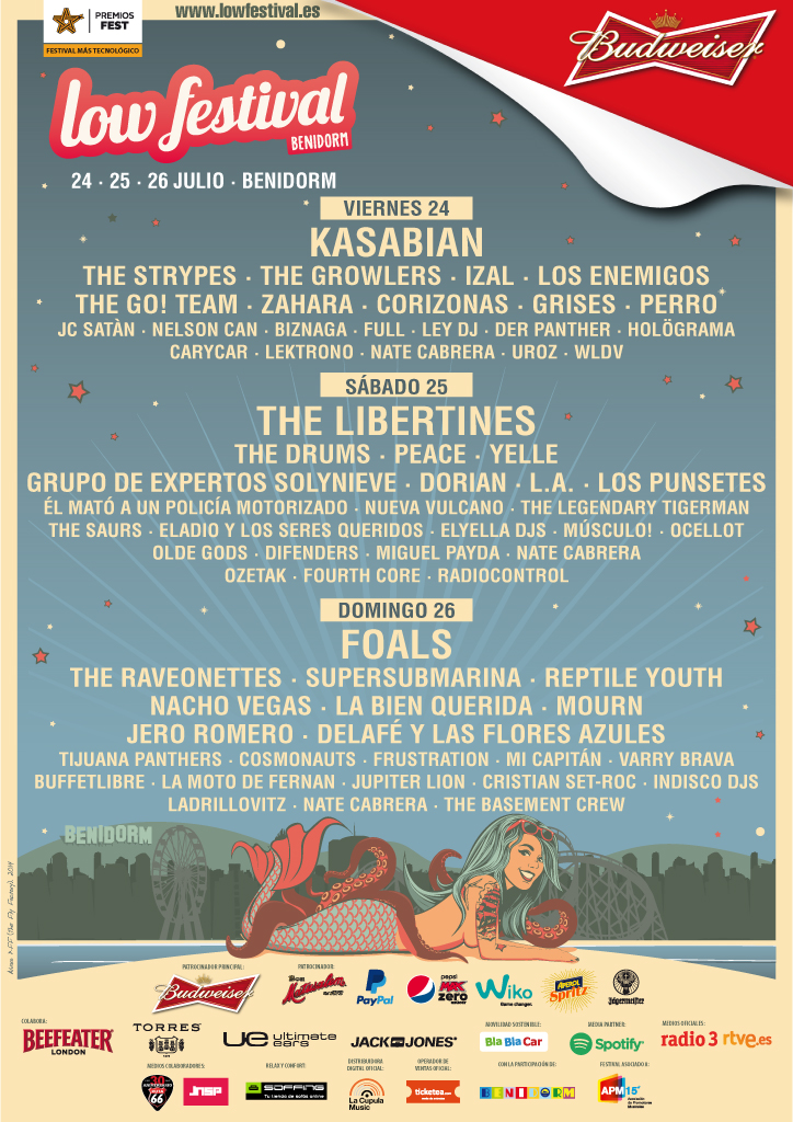 Este cartel sitúa a Low Festival 2015 es uno de los festivales de verano en Valencia con mayor aceptación. Hasta Benidorm se acercan miles de personas desde diferentes partes del país, para disfrutar de todos lo grupos y artistas de primer nivel que actúan durantes estos 3 días.