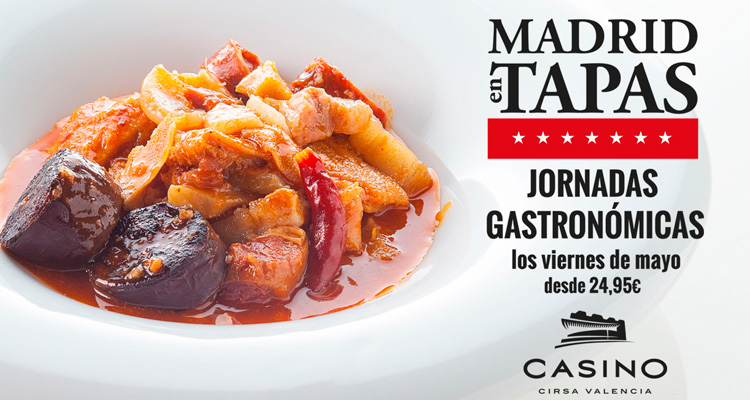 Madrid en tapas en Casino Cirsa Valencia Disfruta de las jornadas gastronómicas "Madrid en Tapas" de la mano del Restaurante ONE Valencia de Casino Cirsa. ¿Cuándo? Fecha Del Friday, 04 de May del 2018 al Friday, 25 de May del 2018 HORA 21:00 h ¿Dónde? LUGAR Casino Cirsa Avda. de las Cortes Valencianas, 59 Ver ficha Comprar entradas El Restaurante ONE Valencia de Casino Cirsa tiene preparado un plan muy especial para los viernes de este mes de mayo. Disfruta de las jornadas gastronómicas “Madrid en Tapas”, un evento en el que poder degustar las tapas típicas de la capital. De la mano del chef del Restaurante One Valencia, Julio Sanchís y su equipo, te transportarás a las calles de Madrid. Una experiencia para tu paladar que no te puedes perder. El menú estará compuesto por seis tapas y dos postres a compartir. Los platos serán los siguientes: Banderillas encurtidas Crema de espárragos de Aranjuez Gambas al ajillo Soldaditos de pavía de bacalao Callos a la madrileña Rabo de toro con ragout de setas. Cierran esta suculenta propuesta tan castiza dos postres típicos de Madrid: Bartolillos rellenos de crema Helado de “Mantecado” Para maridar este menú, el restaurante de Casino Cirsa Valencia ha elegido el tinto Las Retamas del Regajal 2015, de la D.O. Vinos de Madrid. El precio por comensal será de 24,95€. Las jornadas gastronómicas del casino valenciano incluyen la entrada, acceso al parking, un aperitivo individual, dos entrantes a compartir, un plato principal, postre y bebida. No te pierdas más eventos de este tipo. Consulta nuestra agenda gastronómica y disfruta de una primavera con mucho gusto. Artículos relacionados Primavera en Valencia Restaurante ONE Valencia en Casino Cirsa Casino Cirsa Valencia Agenda de eventos gastronómicos en Valencia