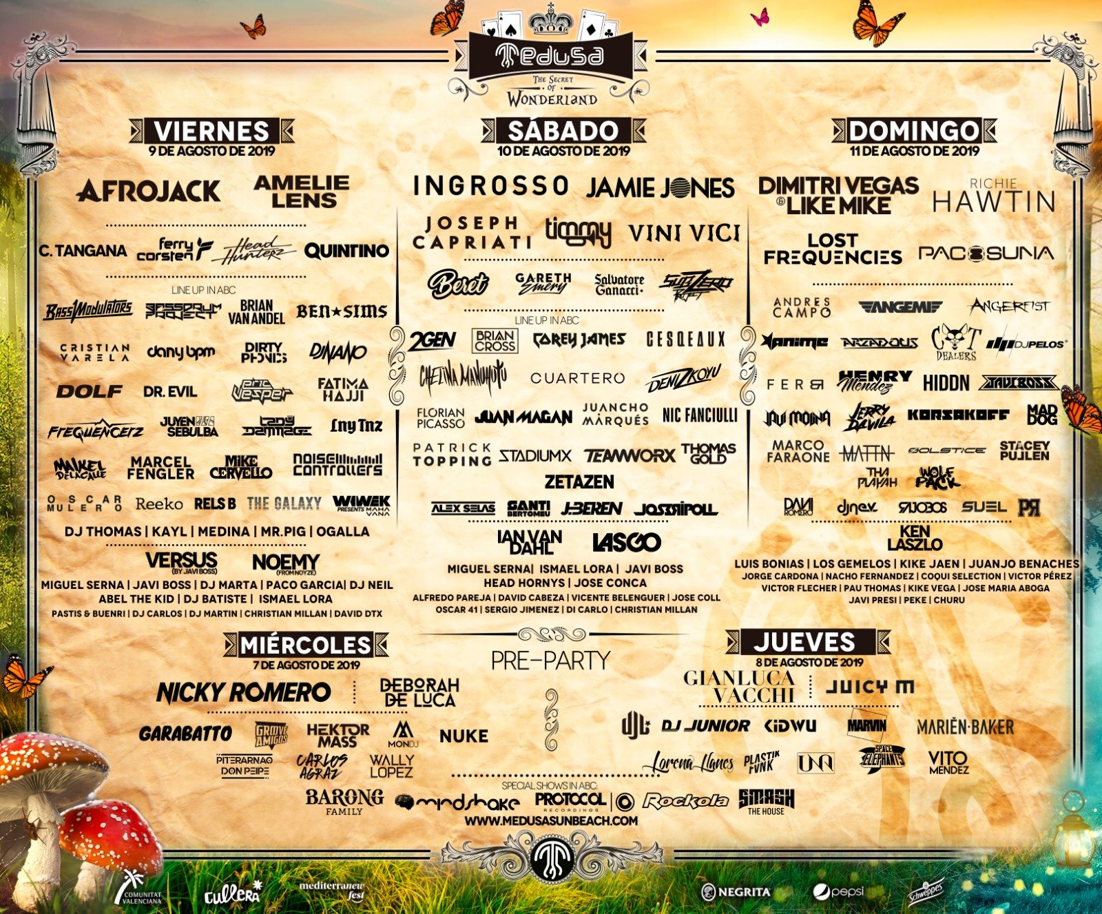 Medusa SunBeach Festival El Medusa Sunbeach pretende batir su propio record de asistencia en su próxima edición del 7 al 12 de agosto ¿Cuándo? Fecha Del Wednesday, 07 de August del 2019 al Monday, 12 de August del 2019 HORA 18:00 h ¿Dónde? LUGAR Cullera parking Enrique Chulio Ver ficha Cullera acoge del 7 al 12 de agosto uno de los mejores festivales de música electrónica en València. El festival Medusa SunBeach reúne a miles de personas amantes de la música electrónica, que disfrutan año tras año de un increíble ambiente de fiesta en la playa de Cullera. Si quieres conocer más festivales de verano en Valencia este verano puedes visitar nuestra agenda de Valencia. El Medusa es el festival con más público de España. En 2018 reunió a más de 300 000 asistentes, este cifra solo la iguala el Arenal Sound de Burriana. Ambos están en el podio de los macroeventos musicales, por delante del Mad Cool de Madrid. Más de 40 artistas del TOP 100 DJ’S han pasado por sus escenarios, y cada edición se suman nuevos nombres a su cartel. Este año buscan batir su propio récord de asistencia. Para ello, han forjado una escenografía basada en el mundo de Alicia en el País de las Maravillas. El lema de este año es ”The secret of Wonderland” y todo el decorado estará diseñado por artistas falleros. Además, sumarán un quinto escenario que estará liderado por la música comercial. Los amantes de la música electrónica van a disfrutar del siempre esperado cartel del Medusa SunBeach. Ingrosso, Nicky Romero, Jamie Jones, Dimitri Vegas y Afrojack son algunas de las confirmaciones. Aunque también actuarán artitas como Beret o C. Tangana. Si no sabes qué hacer en Valencia en pleno agosto, no dudes en disfrutar de uno de los mejores festivales de música electrónica. Además, ya puedes comprar las entradas para el Medusa Sunbeach en su página oficial. En definitiva el sol, la playa, el verano, la gente, varios escenarios y muchos más ingredientes convierten al Medusa Sunbeach en una gran fiesta. ¿Te la vas a perder? Cartel Medusa Sunbeach Cómo llegar al Festival Medusa Sunbeach El Festival está situado en la Playa de Cullera. Se puede llegar con cualquier tipo de transporte; en tren, autobús, avión o andando desde el centro de Cullera. Tren: Desde la Estación del Norte (Valencia) – Cercanías destino Gandía Avión: Artículos relacionados Verano Fiestas en los pueblos de València en verano Festivales de verano en València 2019 Festivales de música en València