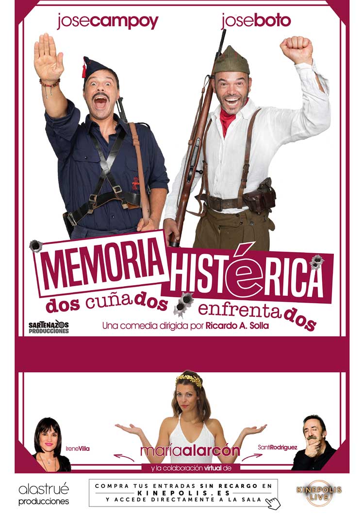 Memoria Histérica en Kinépolis Valencia Vive una guerra en la que todo vale: el humor, el amor y la cordura ¿Cuándo? Fecha Del Saturday, 04 de April del 2020 al Saturday, 04 de April del 2020 HORA 22:30 h ¿Dónde? LUGAR Kinépolis Valencia Avenida de Francisco Tomás y Valiente s/n Ver ficha Comprar entradas El ser humano es el único animal de su especie que tropieza cien veces en la misma piedra, pero cuando esa piedra es la guerra, la cosa no suele acabar bien. Descúbrelo en Memoria Histérica el próximo sábado 4 de abril a las 22:30 en Kinépolis Valencia. ¡EVENTO SUSPENDIDO! La Generalitat Valenciana decide cerrar los espacios del ocio y cultura por el coronavirus. Por tanto y hasta nueva orden todos los eventos de Kinépolis Valencia quedan suspendidos hasta nuevo aviso. Si te gusta el teatro y la comedia, no te pierdas nuestra agenda de València ¡está repleta de planes! En este campo de batalla, Pedro y José Antonio (José Campoy y José Boto) se enfrentan cara a cara, cada uno desde su trinchera, desde su bando y con sus armas, a la defensa de sus intereses, de sus creencias y de sus posicionamientos. Todo ello animado y alentado por las bellas palabras de Atenea, Diosa de la Guerra, (Maria Alarcón) que les anima a no cejar en su empeño de discutir, de pelear y de no reconciliarse nunca. Pero ellos no son militares; son peluquero y taxista, en un sitio que no les corresponde y en un tiempo que no vivieron. Solo les queda defender su posición ante el enemigo como mejor saben; con humor. ¿Hay mejor arma que la palabra, la ironía y la risa para desarmar a tu enemigo? ¿Puede ser tu enemigo tu mejor amigo? ¿Y si el de en frente… es tu “cuñao”? En esta guerra todo vale: el humor, el amor y la cordura ¿o no? Compra ya tu entrada y no te pierdas este monólogo en València donde las risas están aseguradas. Entradas Kinépolis Artículos relacionados Las tapas valencianas que no puedes perderte Monólogo de Ismael Lemais y La Kiskillosa en València Ciclo de conciertos en La Marina de València Escape room en València