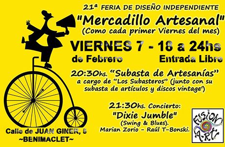 Mercado artesano y de reciclaje en Fusionart Multiespacio Fusionart Multiespacio presenta la 21ª Feria de Diseño Independiente ¿Cuándo? Fecha Del Friday, 07 de February del 2014 al Friday, 07 de February del 2014 HORA 00:00 h ¿Dónde? LUGAR Benimaclet Benimaclet Ver ficha Fusionart Multiespacio celebra este viernes 7 de febrero, la 21ª Feria de Diseño Independiente, en la que 20 artesanos ponen en exposición y venta sus trabajos. En la Feria se pueden encontrar objetos hechos a manos, reciclados, vintage y de segunda mano. Los artesanos ponen en marcha una subasta a las 20:30 en la que cada expositor escoge un artículo por el que el público puede pujar. Y para terminar el evento con música, a las 21:00 comienza el concierto en directo de Dixie Jumble de estilo swing and blues. Una interesante propuesta que se celebra en Fusionart Multiespacio el primer viernes de cada mes. Y todo ello de forma gratuita.