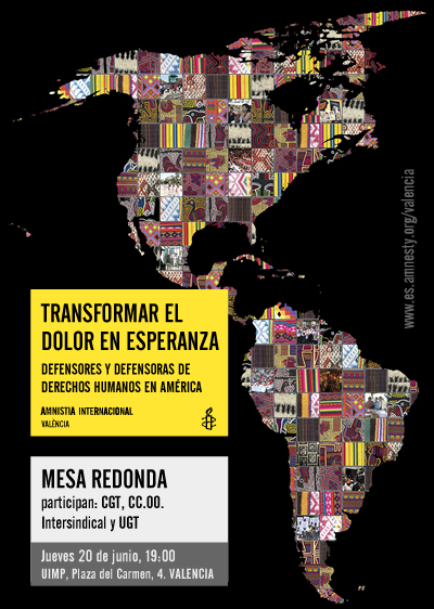 Mesa redonda de Amnistía Internacional: “Transformar el dolor en esperanza” Amnistía Internacional Valencia presenta un informe sobre la labor de defensores y defensoras de los DDHH en América, con la participación de diferentes sindicatos. ¿Cuándo? Fecha Del Thursday, 20 de June del 2013 al Thursday, 20 de June del 2013 HORA 19:00 h ¿Dónde? LUGAR Palau de Pineda: UIMP Plaza del Carmen, 4 Ver ficha El Área de Defensores y Defensoras de los Derechos Humanos de Amnistía Internacional Valencia organiza una mesa redonda en la que se presentará el informe “Transformar el dolor en esperanza”. El informe recoge datos sobre la labor de defensores y defensoras de los DDHH en América, y en su presentación participarán representantes de los sindicatos CC.OO., CGT, Intersidical y UGT. La cita será el próximo jueves 20 de junio a las 19:00, en la Universidad Internacional Menéndez Pelayo (UIMP).