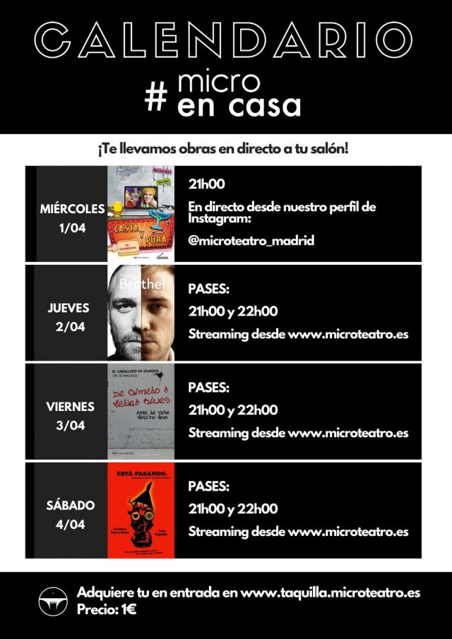 Microteatro en streaming desde casa Micro en casa, una manera de disfrutar de teatro sin moverte de tu salón ¿Cuándo? Fecha Del Wednesday, 01 de April del 2020 al Saturday, 04 de April del 2020 HORA 21:00 h ¿Dónde? LUGAR Tu casa Tu casa Ver ficha Microteatro son obras de 15 minutos que se realizan para 15 espectadores en salas de menos de 15 m2. Con la medida de aislamiento hay que buscar planes para hacer en casa y desde Microteatro lanzan el proyecto #microencasa. Como no se puede salir de casa, han decidido llevar las obras desde el salón de los actores a tu salón. La nueva programación de micro en casa será del 1 al 4 de abril, el miércoles 1 de abril con un directo gratuito desde el Instagram de Microteatro y el resto de días con dos pases diarios a las 21:00 y 22:00h, con una obra diferente cada día. ¿Cómo funciona? En la web taquilla.microteatro.es puedes conseguir tu entrada por 1 euro simbólico. Con la entrada, recibirás en tu correo electrónico un enlace y una contraseña para disfrutar del vídeo en directo. Se podrá acceder al teatro, cinco minutos antes de la función. Después de la obra, los actores responderán dudas y comentarán la experiencia con el espectador. Para acceder a los comentarios hay que hacer click en ‘Abrir en Youtube’ e iniciar sesión de tu usuario de Youtube. Se recomienda utilizar un portátil, ordenador o smart TV para poder comentar durante la retransmisión. Artículos relacionados Festival ‘Yo me quedo en casa’ Opera online gratis de la MET Homenaje de aplausos 10 museos para visitar desde casa