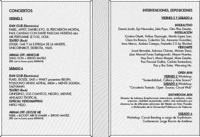Mimaa en Valencia Una nueva experiencia de música llena de novedades para disfrutar ¿Cuándo? Fecha Del Friday, 05 de October del 2012 al Saturday, 06 de October del 2012 HORA 00:00 h ¿Dónde? LUGAR Alicante Alicante Ver ficha MIMAA es un festival que presenta las últimas propuestas en músicas avanzadas sin cerrarse a un género musical, aunque más hacia las fusiones electrónicas. Tiene como objetivo dar a conocer las propuestas de artistas reconocidos por sus contenidos, por su carácter de innovación y experimentación musical y visual. Te esperan numerosos conciertos, sesiones de deejay, cine y otros formatos audiovisuales en torno a la música y sus interacciones. La tercera edición de MIMAA se celebra los días 5 y 6 de octubre en Alicante. Las entradas tienen un coste de 25 euros anticipadas y 30 euros en taquilla. Consulta la programación del festival: Artículos relacionados Deleste Festival amplía su cartel Festival Esclata-Só Valencia 2012 Concierto de Russian Red en Valencia Concierto Malú en el Palau de la Música de Valencia IV Festival Octubre Ayora en Valencia
